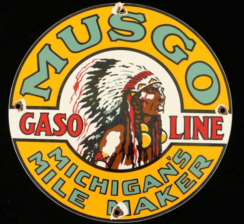 "Musgo Gasoline Michigan's Mile Maker" gas pump sign. Bright gold, red and green with Indian chief in the center. Smooth porcelain on both sides, some rust and chipping around mounting holes. Measures 11 3/4" dia.