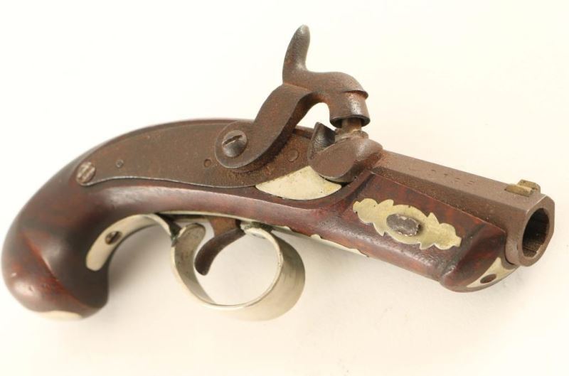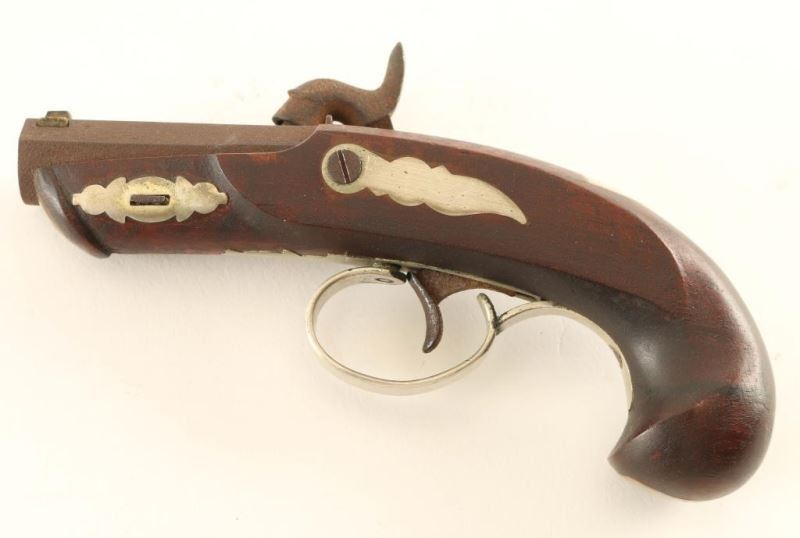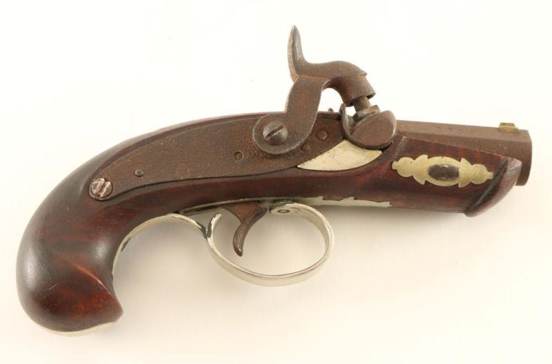 SN: 0198 Muzzle loading percussion pistol with an approximate .41 caliber bore. 1 1/8" barrel, dovetailed brass blade front sight, fixed rear window sight, non-ferrous 'silver' furniture, and one-piece wood stock. The barrel, lock, trigger & hammer have oxidized and display an aged brown appearance with scattered rust. Action performs well, bore is fair and wood stock is good. Condition is fair.