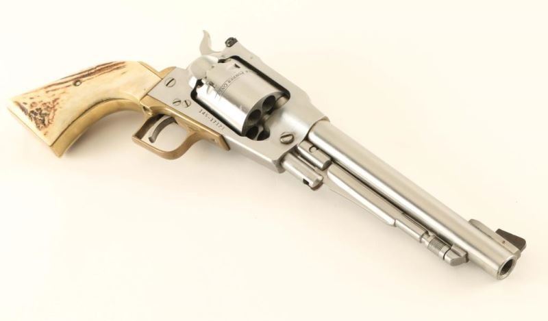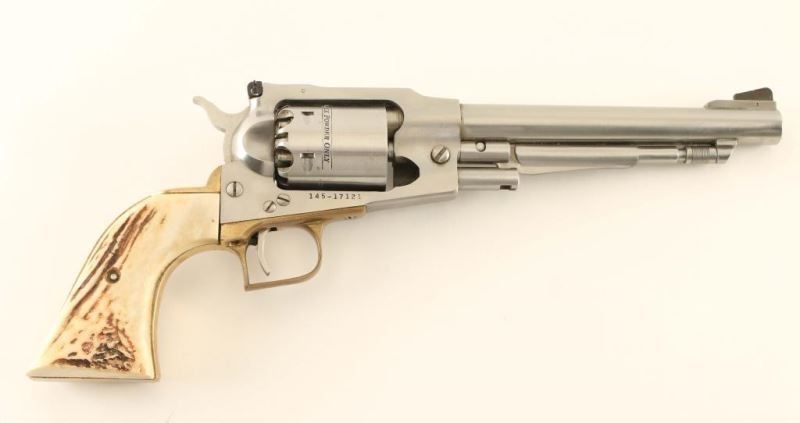 Highly revered stainless steel single action percussion revolver, circa 1979. Brushed finish, 7.5" bbl. ramp front sight, adjustable rear sight, loading lever, non-fluted cylinder, brass square back trigger guard, serrated trigger & hammer spur and custom two piece stag grips. Revolver shows moderate handling marks. Action is smooth, bore is pristine and custom stag grips are fine. Condition is very good++. ***Antique Firearm***