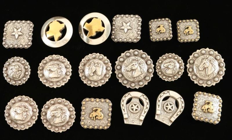 All nickel construction with cowboy, Texas, horses heads, and star & horseshoe motifs. Nine matched pairs (18 total). Great for projects.