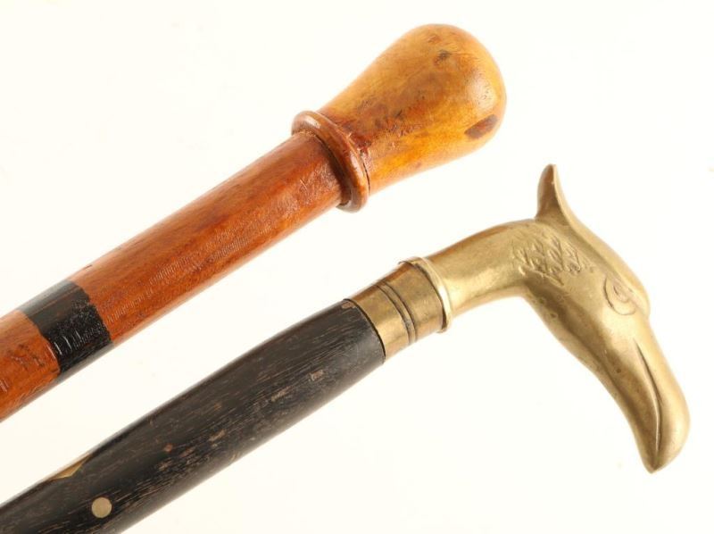 (1) Wooden cane with alternating textured and plain ribbon swirl design. Plain wooden knob at top with a rubber tip, measures 37 1/2" long. (1) Wooden cane painted black with a diamond and dot brass inlay. Bird's head grip and tip also in brass. Measures 37" long. One diamond inlay is missing, shows use.