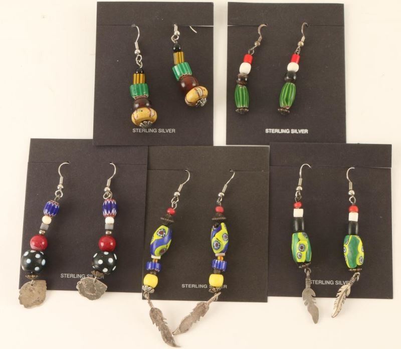 All with different shaped and colored beads with sterling silver French hooks. Two pairs have silver feather dangles and another a chief's head dangles.