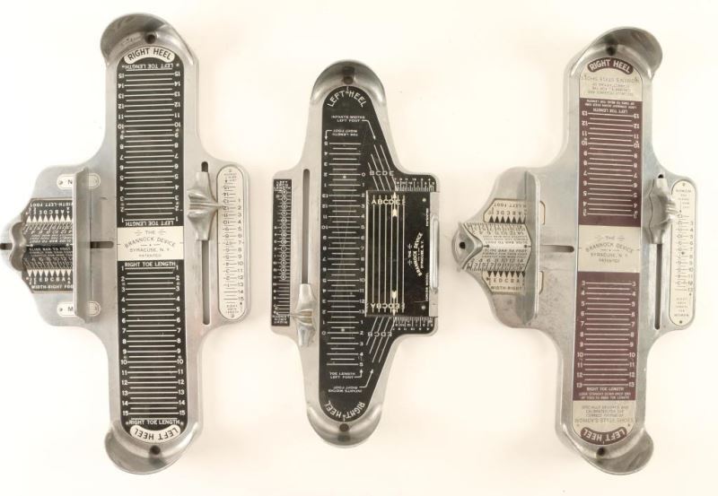 All metal construction with sliders for width and arch. One each for men, women and children's sizes. "The Brannock Device, Syracuse, N.Y."