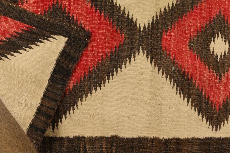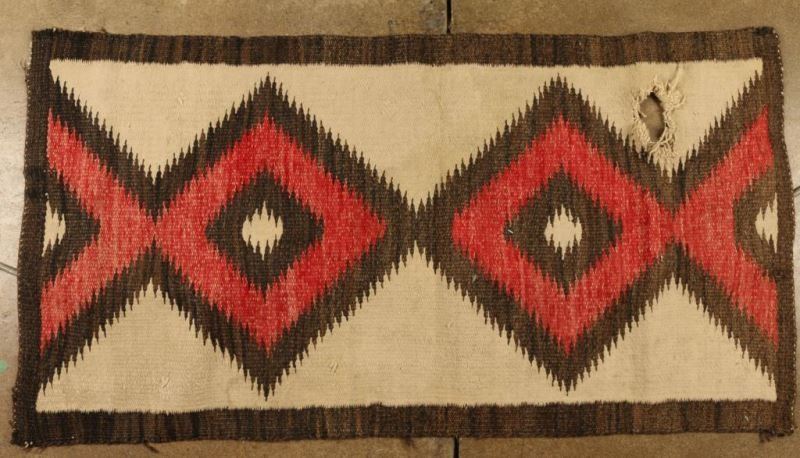 In red, white, gray and black colors, fair condition has a large 4" hole, shows age. 43"X22"