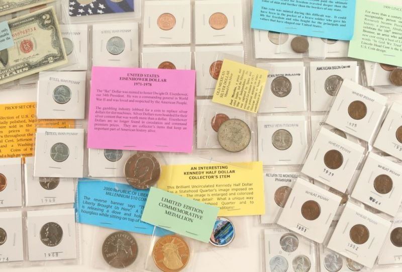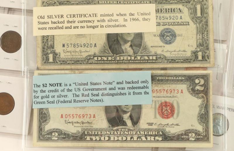 Including: Civil War Penny, Old Proof Coins, US Mint Set, Wheat Cents, Steel War Cents P-D-S, Indian Head Cents, Lincoln Cents uncirculated, Old Jefferson Nickels, Old Eisenhower Dollar, Jefferson Nickels uncirculated, Buffalo Nickels, Old $2 bill, Silver Certificate, Mexican Silver Peso and much more!