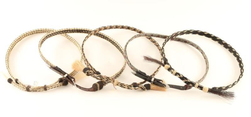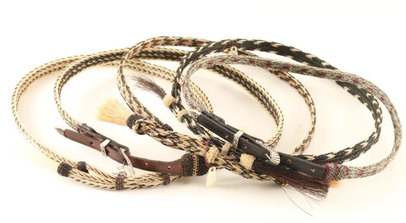 All horsehair in earth tones, two have leather ends with silver metal buckles, keepers and tips.