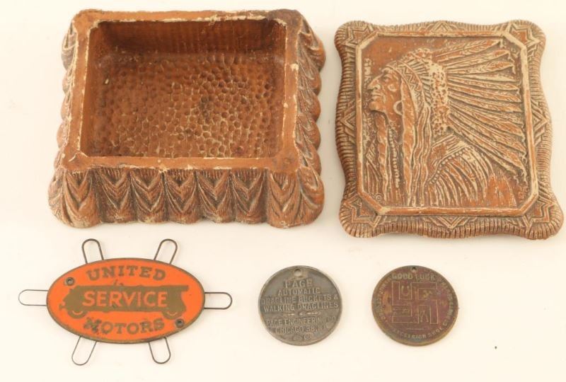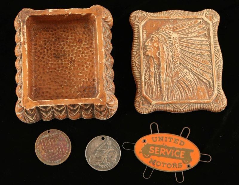 Molded brown resin jewelry box with Indian Chief in a headdress for a lid. Measures 4 1/4"l x 3 3/4"w x 1 1/2"d. Includes a Good Luck Medal from Excelsior Shoe Company-July 1910, Page Engineering Co. Medal, and a United Service Motors spark plug gap tool.