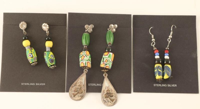 Including; post earrings with silver flower at the top and multicolored bead dangle, flower post top with long cylinder beads that end in a silver teardrop floral motif dangle, and colored beads on French wire-one of the bottom beads has a piece which has broken off.