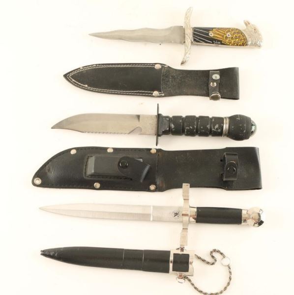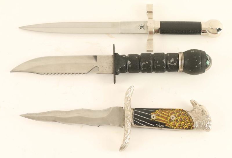 (1) Survival knife with 420 stainless steel blade, compass and tools in handle with sharpening stone and sheath. (1) Fantasy knife with stainless steel wavy blade, pheasant head pommel on handle and feather design guard in faux leather sheath. (1) Repro Nazi knife with stainless steel blade and black plastic sheath with chain.