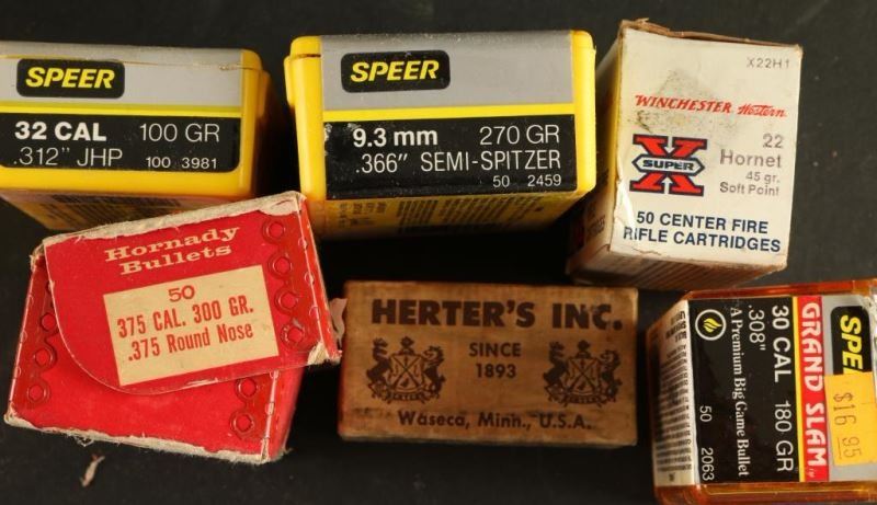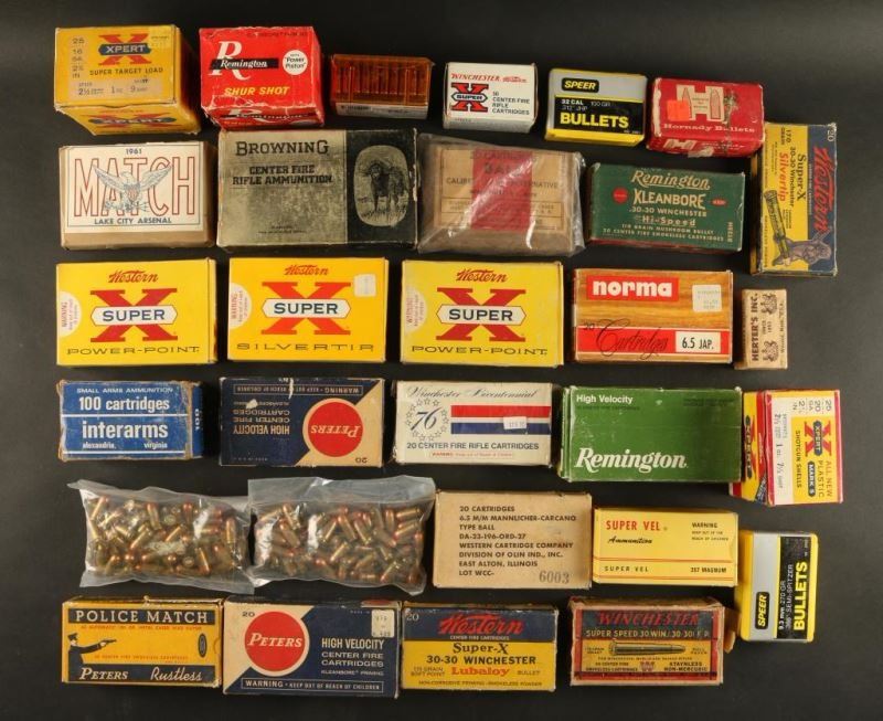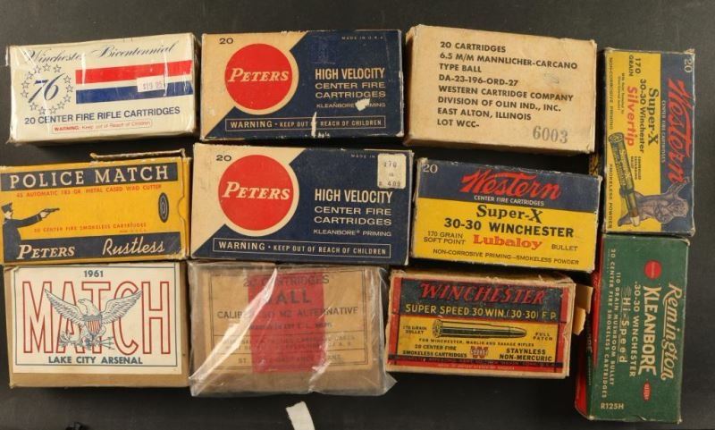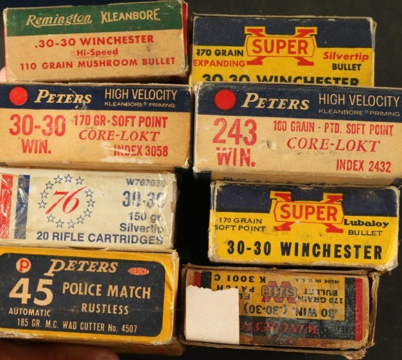 Various calibers including; Western 20 Ga, InterArms 9mm, Wester 30-30, Peters 243 Win, Browning 375 H&H, Lake City Arsenal 30 Match. Some partial, some full boxes.