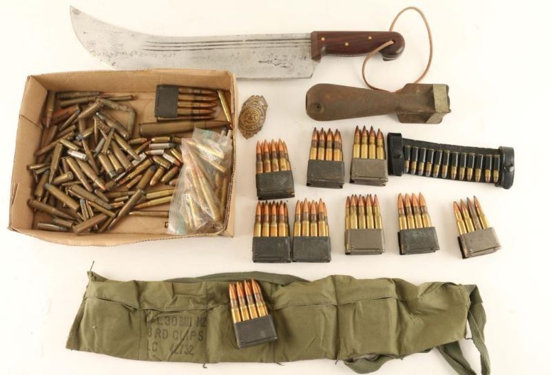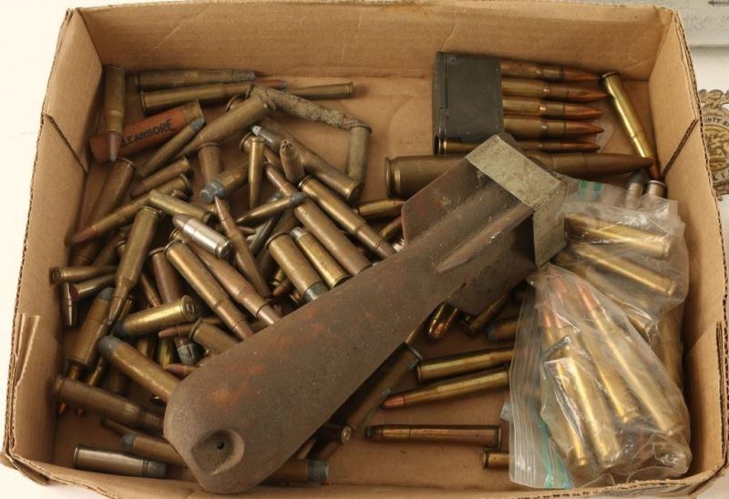 Including bullets, trench art, gun locks, badge, and a large custom knife which has a sawfish engraved on the blade.
