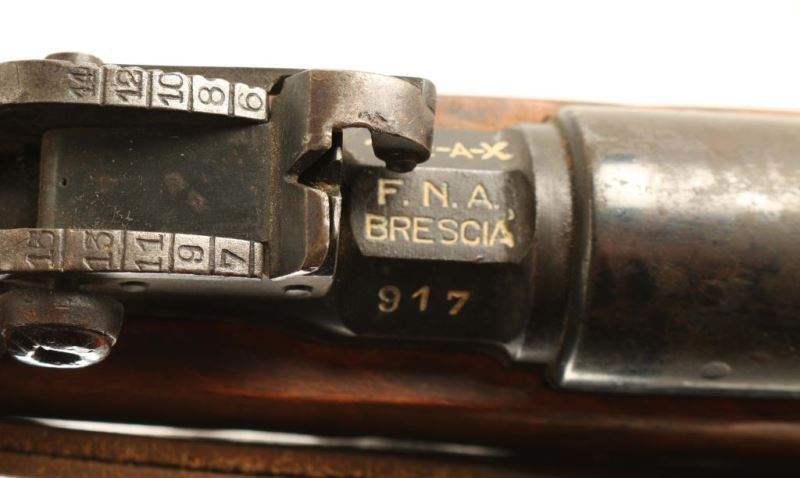 'Moshetto' Barrel length17.63", overall condition fair; 40% original finish remaining, bayonet has some rust and barrel shows rust and pitting. Adopted in 1893, this carbine was meant to serve cavalry units. features a permanently attached, folding spike bayonet. Brescia Arsenal. *C&R Firearm*