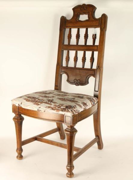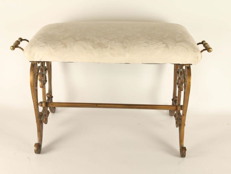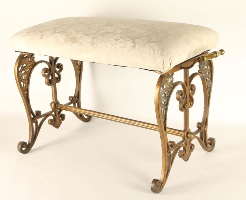 Oak chair upholstered with Western cowboy fabric and brass based vanity seat with floral motif.