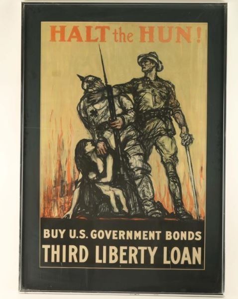 This vintage World War I poster features a American soldier protecting a woman and child from a German soldier. It reads, "Halt The Hun! Buy U.S. Government Bonds Third Liberty Loan". Image measures 28 1/2"x19 1/2" in silver metal frame.
