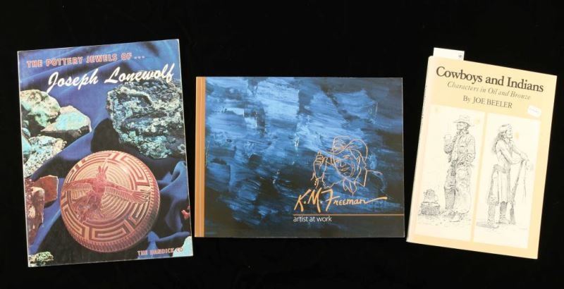 Collection of Books all signed by the authors; 'Cowboys and Indians, Characters in Oil and Bronze' by Joe Beeler, 'K.M. Freeman Artist at Work' signed by Bonnie Adams Freeman 80/500, and 'The Pottery Jewels of Joseph Lonewolf'.