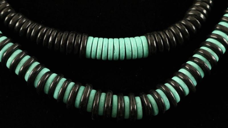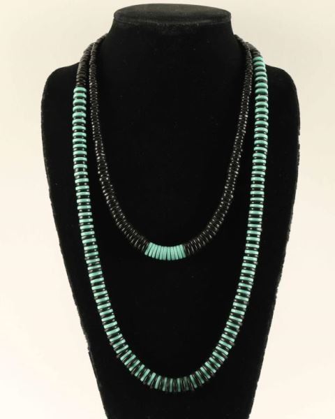 (1) Turquoise and Jet Indian Bead Necklace was inspired by the traditional look of old pueblo jewelry that's been admired for generations! Combined with genuine natural Jet, this 2-color design graduates from 10mm Turquoise discs at the center to 4mm high-grade, Jet discs at the ends. This exquisite strand was finished with Sterling rounds and a lobster claw clasp. About 21" long, it's ideal for a man or woman. (1) Turquoise Shell Navajo Bead Necklace has authentic pueblo style. Graduating, black coconut shell (4mm to 13mm) alternate with genuine, blue-green Turquoise wheels. These are about 28" long, (includes Sterling lobster claw clasp). Native American designed and strung by Mark Kasuse. These would be great paired together!