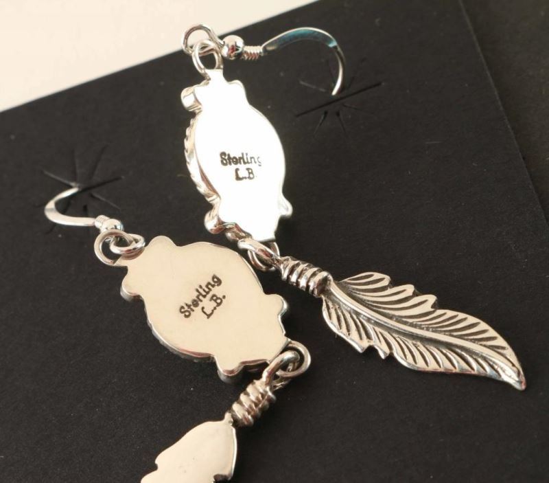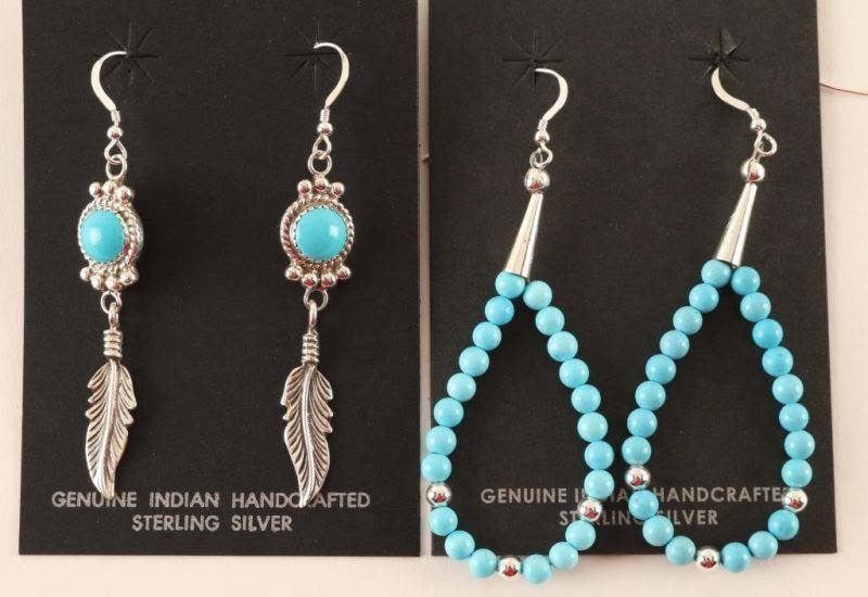 (1) Sleeping Beauty Blue Navajo Beaded Earrings take inspiration from the old pawn jewelry of Santo Domingo. Turquoise Magnesite, 5mm rounds are spaced with 3mm Sterling sparklers. A simple but standout southwest style, these are finished with Sterling cones. About 3-1/4" long (including hook) & 1" wide. Designed & strung by Lula Begay. (1) Natural 8mm Kingman Turquoise Feather Earrings hold a colorful, Arizona round that's wrapped with twist wire and accented with 3 drops on the top and 4 on the bottom. A feather dangle adds sparkle and movement and including the hook, they're 2-3/4" long. Stamped 'Sterling'.