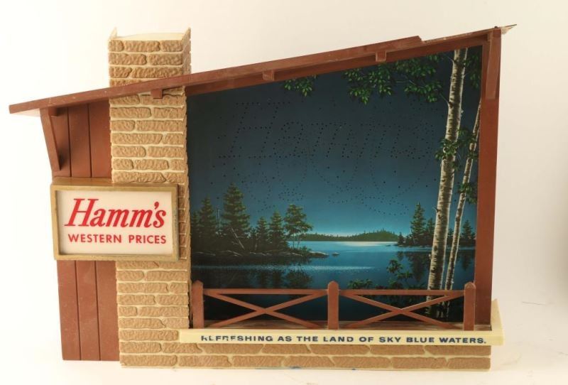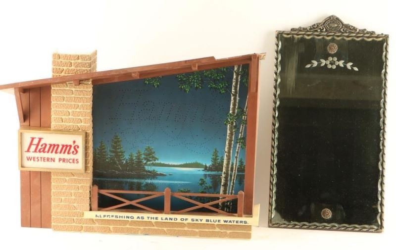"Hamm's Western Prices, Refreshing as the Land of Sky Blue Waters. 'Hamm's' and glasses light up with sparkling light effects on a lakefront scene. Part of roof on front has broken off. In working condition. Includes Victorian cut glass mirror with metal floral motif medallions.