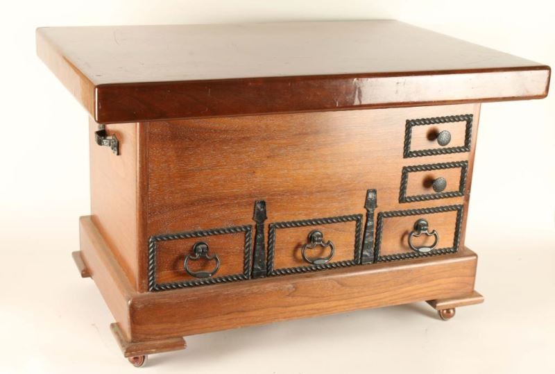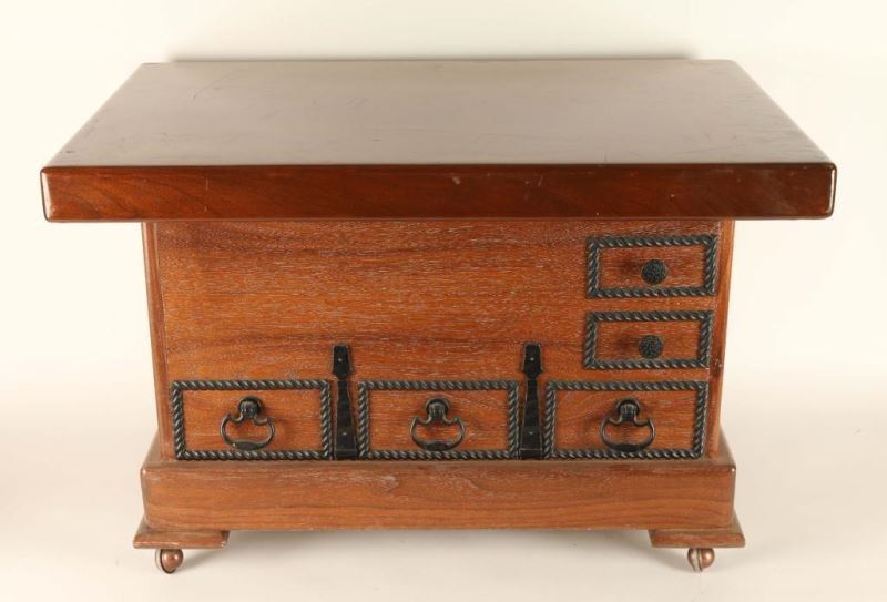 Solid wood base accented with black wrought iron. Wood top with high gloss finish. Measures 30"x20".