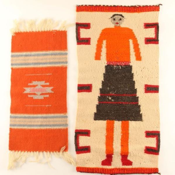 One figural weaving of woman 28"x13", small damage with openings to weaving. Also included 20"x9 1/2" Chimeo runner.