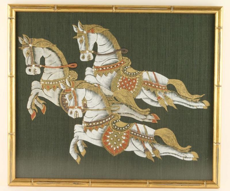 Unsigned depicting three horses with fancy saddles in gold frame. Image size 18 1/2"x15 1/2".