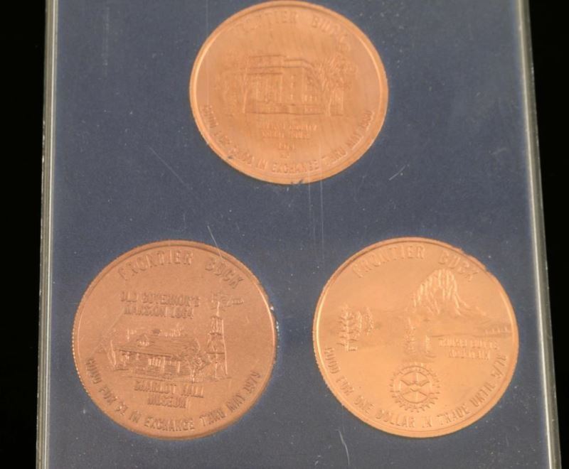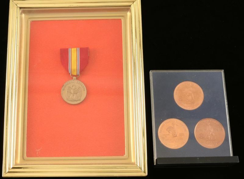 Framed National Defense Metal and 3 Frame Prescott Frontier Rotary Club coins.
