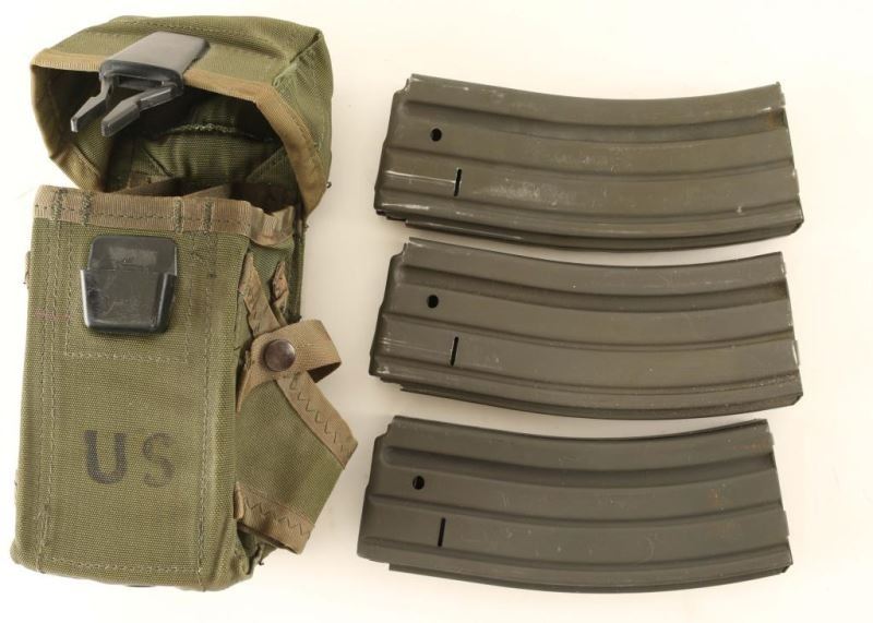 (2) Sterling in very good condition & (1) ArmaLite AR-18 in good condition w/ scattered spots od dark rust on the left side. Includes a U.S. marked magazine pouch.