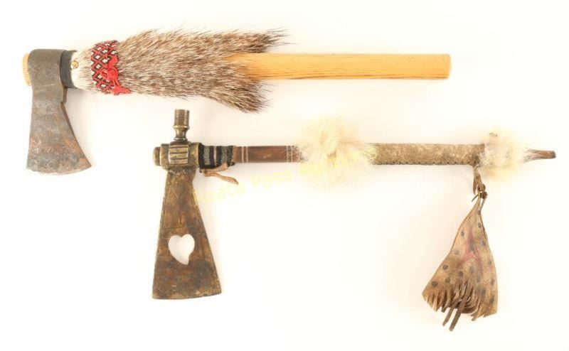 1 tomahawk with wood handle, javelina hair and beaded band, aged metal blade. 1 Bleeding Heart tomahawk with rawhide wrapped wood handle with fur accents, brass engraved blade with heart cutout. Great wall hangers.