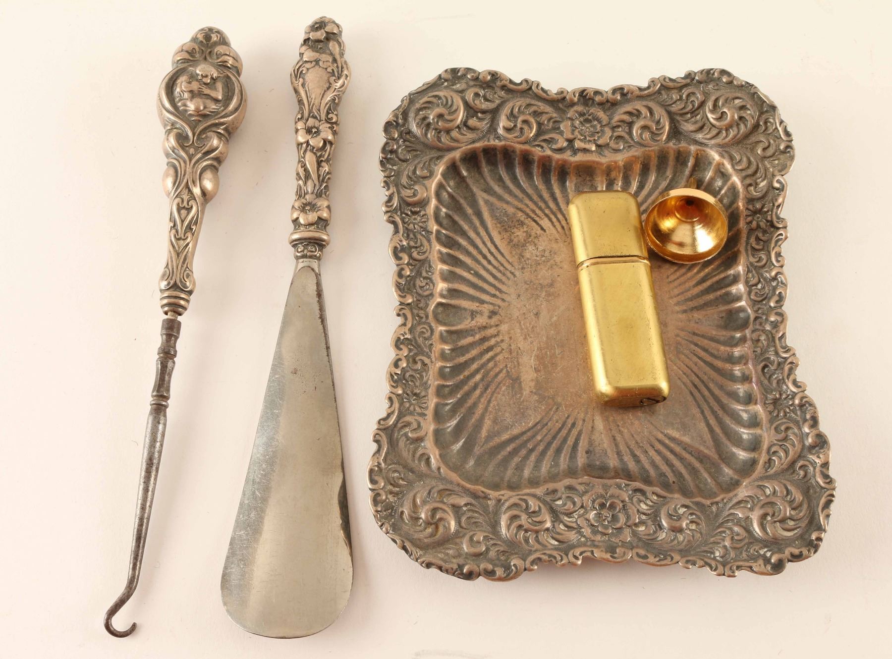 Including; silver shoehorn with molded floral motif handle, button hook with scroll and cherub motif and a silver tray with flowers and scrolls marked 'Sterling 3588'. Also includes a cloth bag with a gold metal perfume sprayer and perfume lid.