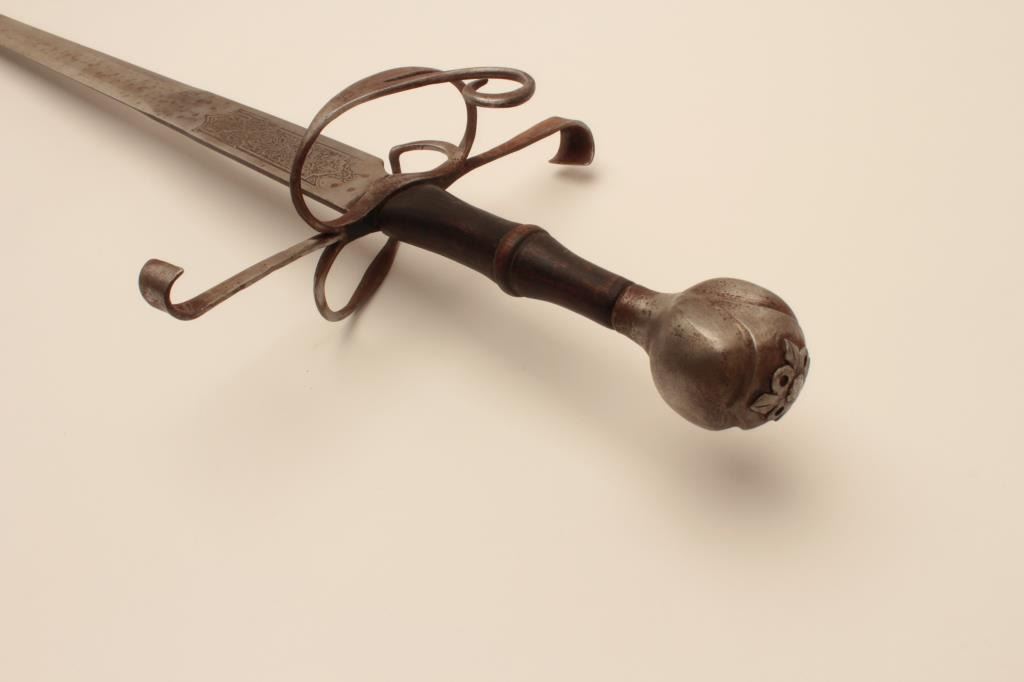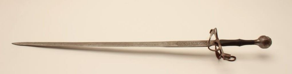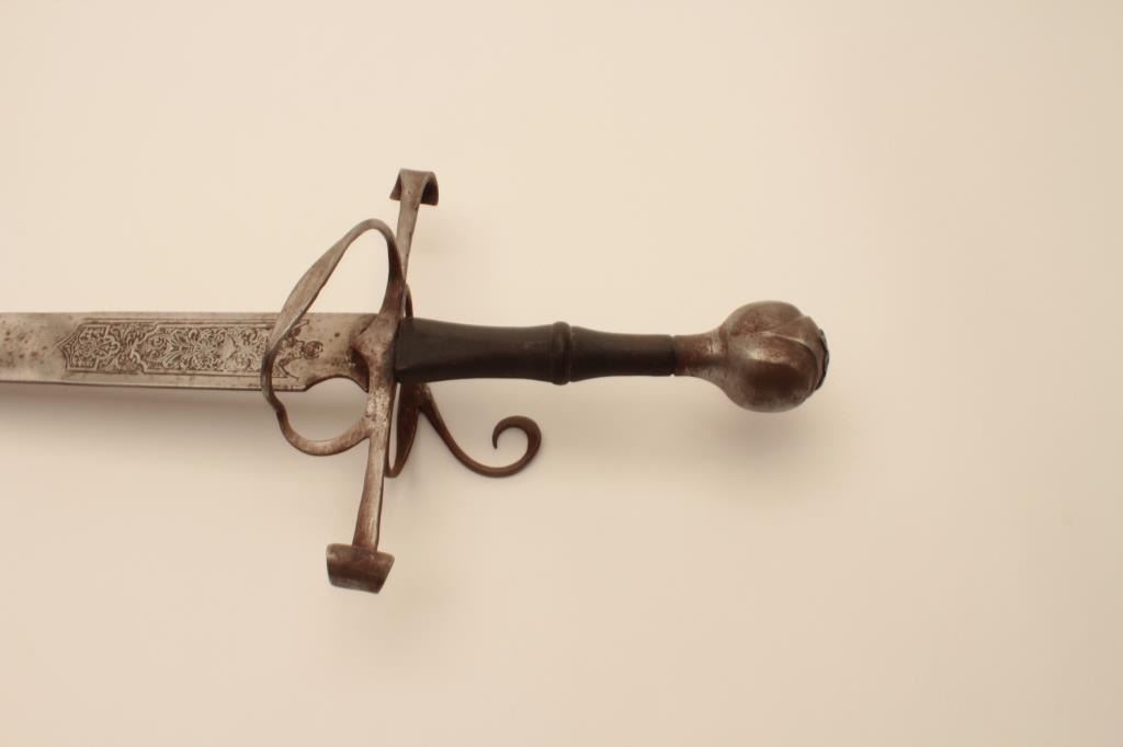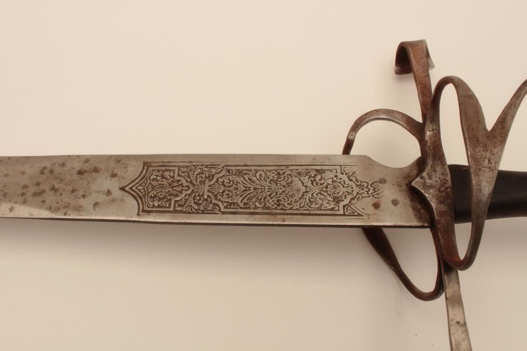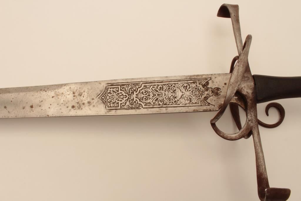 18AT-9 VICTORIAN RAPIERVictorian broadsword with fancy etched blade. Well-formed blade and pommel. The blade is tempered. Measures 42” overall with a 34” blade. Light pitting. 1 ½” wide at the widest point. Est.: $600-$1200Victorian broadsword with fancy etched blade. Well-formed blade and pommel. The blade is tempered. Measures 42” overall with a 34” blade. Light pitting. 1 ½” wide at the widest point. Est.: $600-$1200