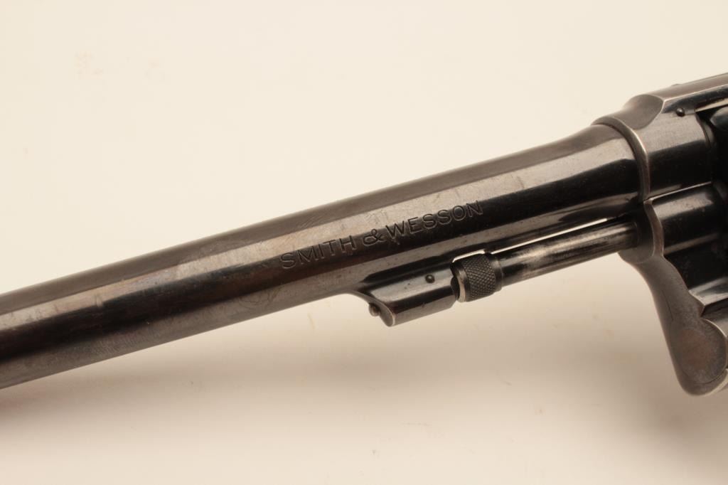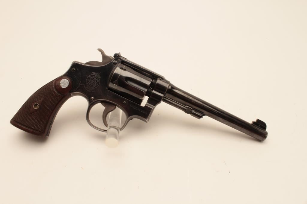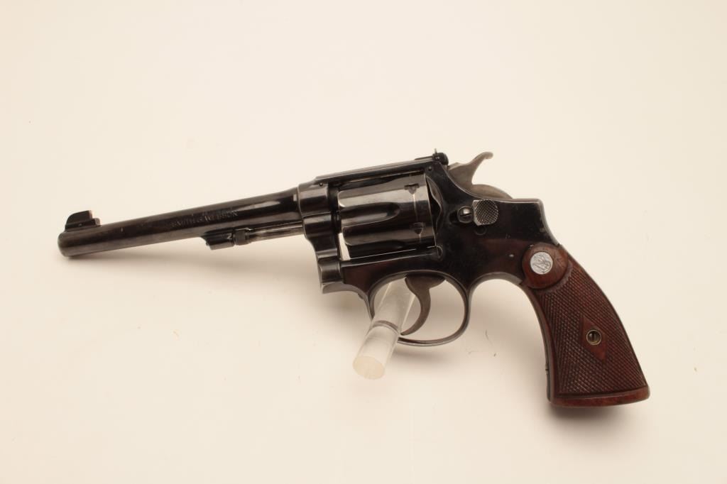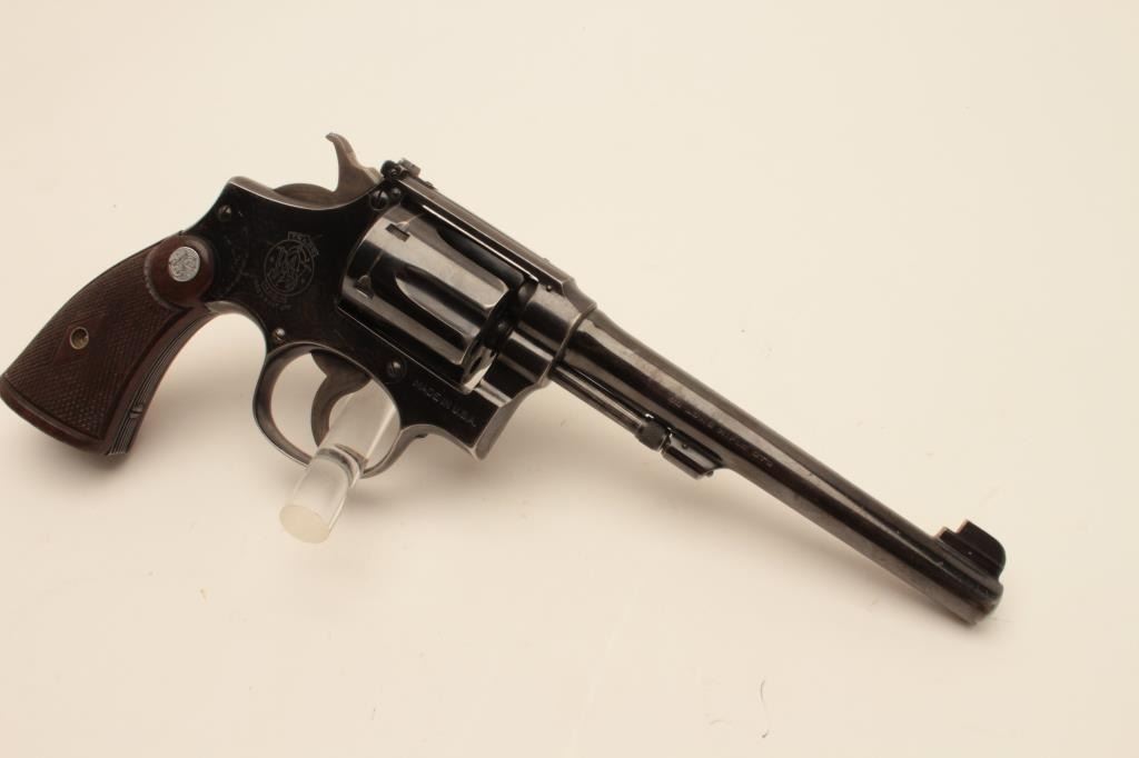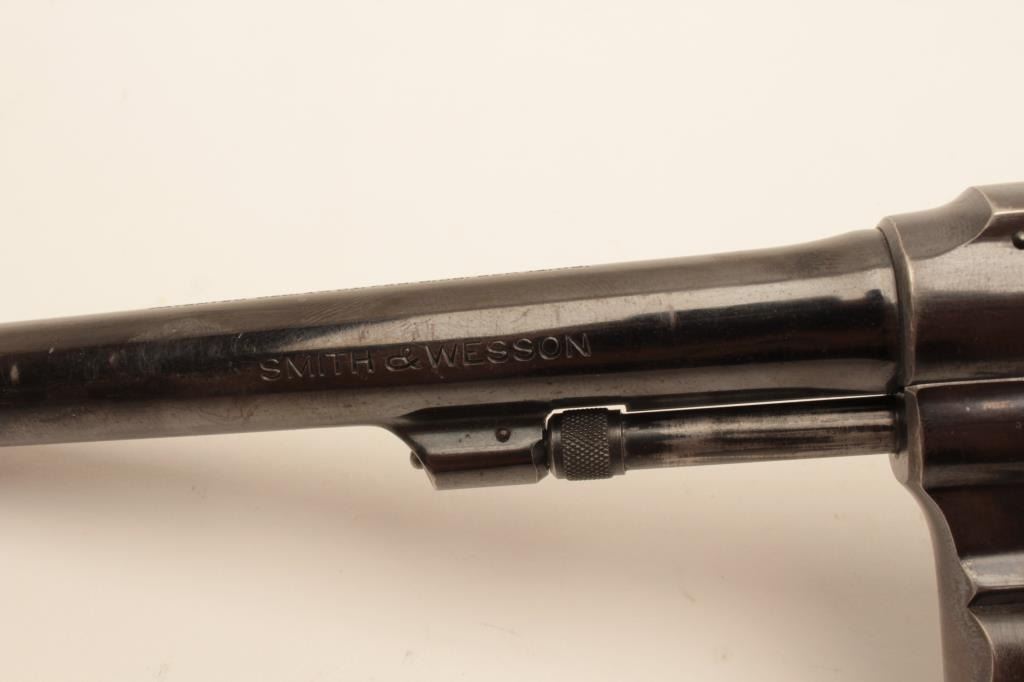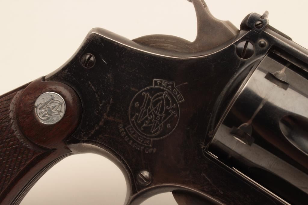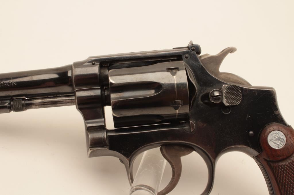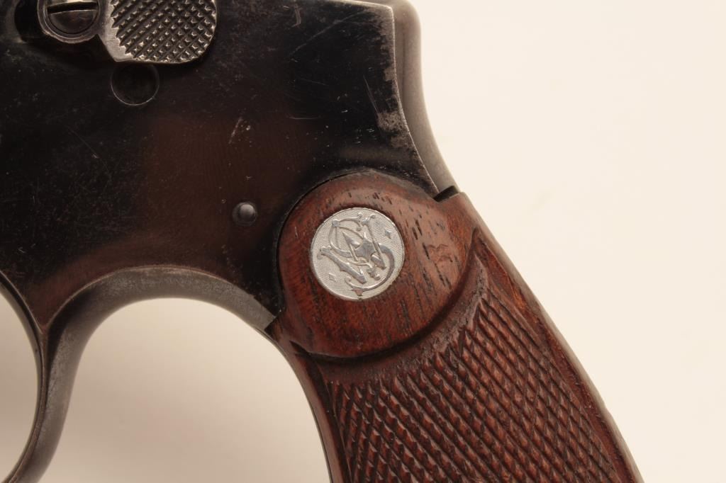 18BL-1 S& W #13470Smith and Wesson Outdoorsman revolver, .22 Long Rifle caliber, Serial #669609. The pistol is in very good overall condition with a 6” pinned barrel. The pistol retains the majority of its blue finish with small mars,wear at the muzzle and a drag line on the cylinder. The pistol features the desirable five screw frame and displays toning case hardening on the hammer and trigger. The silver medallion checkered wood grips are invery good condition with only storage marks noted. The bore is good, the action is crisp and markings are sharp on this desirable Outdoorsman. Est.: $1,000-$2,000. (C+R).Smith and Wesson Outdoorsman revolver, .22 Long Rifle caliber, Serial #13470. The pistol is in very good overall condition with a 6” pinned barrel. The pistol retains the majority of its blue finish with small mars,wear at the muzzle and a drag line on the cylinder. The pistol features the desirable five screw frame and displays toning case hardening on the hammer and trigger. The silver medallion checkered wood grips are invery good condition with only storage marks noted. The bore is good, the action is crisp and markings are sharp on this desirable Outdoorsman. Est.: $1,000-$2,000. (C+R).