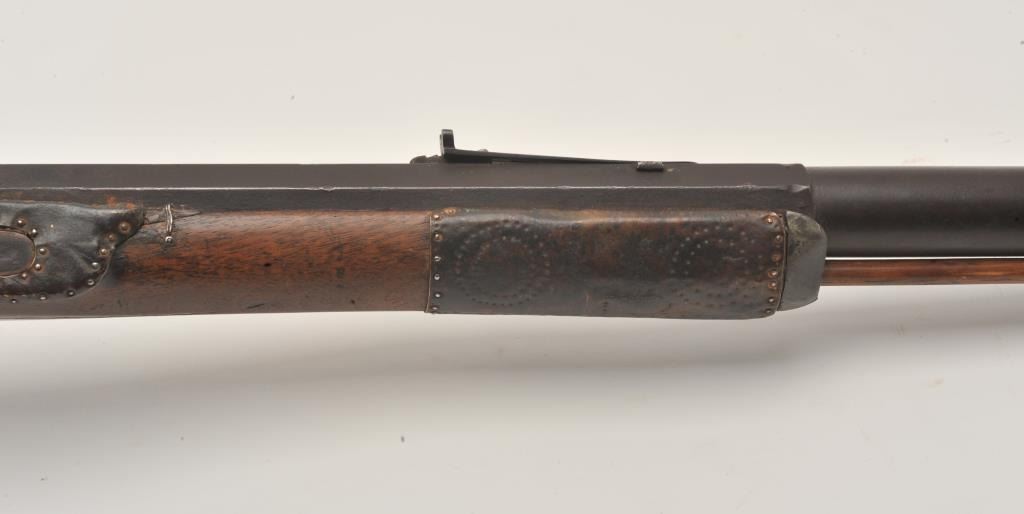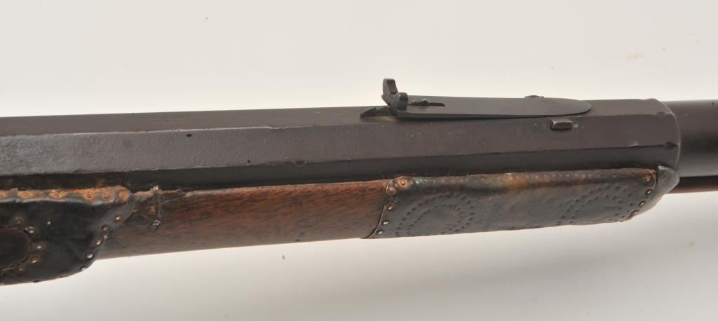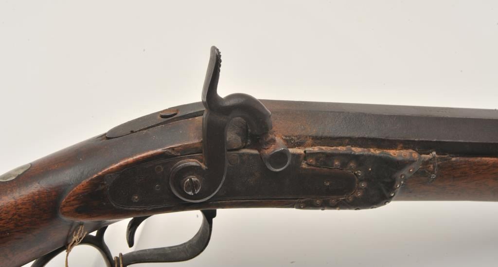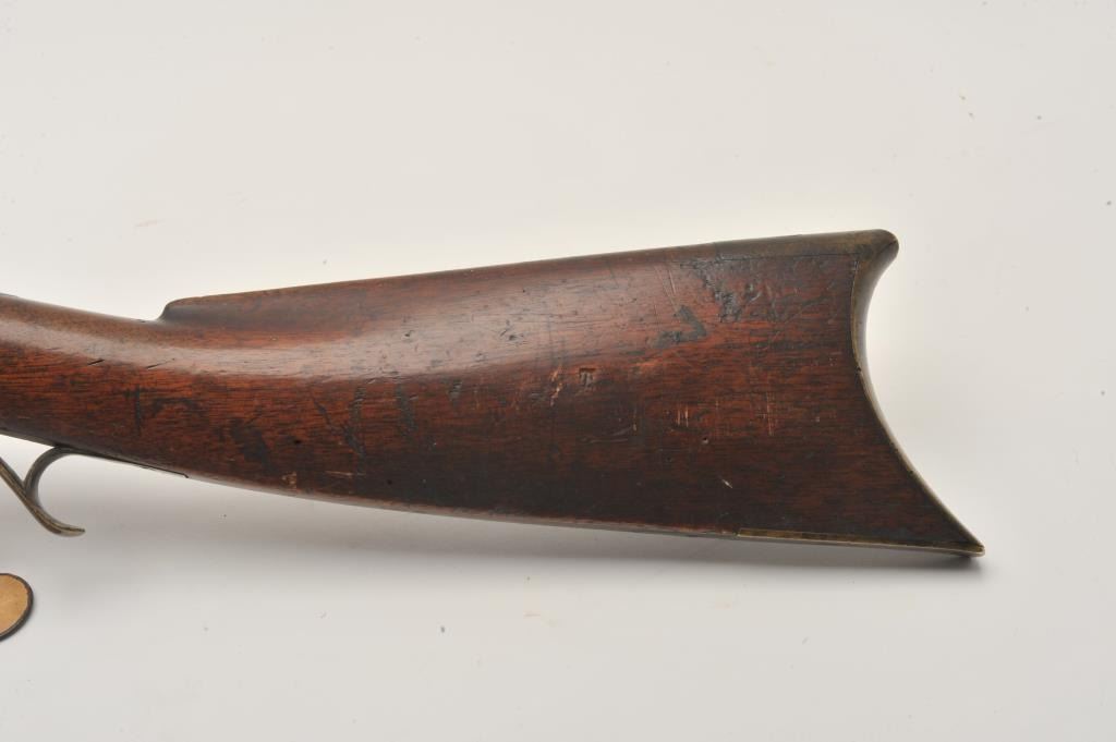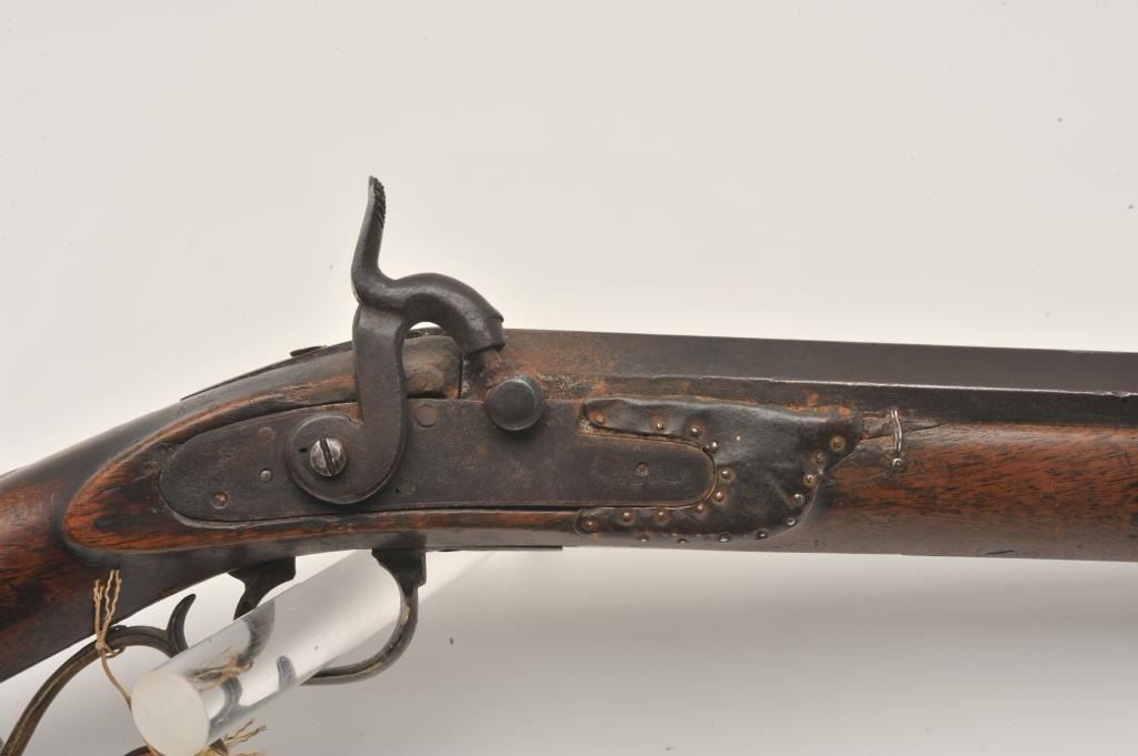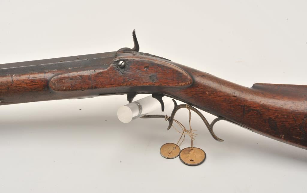 18EMY-21 INDIAN TACKED 1/2 STOCK PLAINSIndian tacked and decorated half stock percussion plains rifle, .41 caliber, half round/half octagon barrel marked “Wm Wingert/Detroit”, wood stock with “T” stamped on left side of stock above the trigger andon the left side of the butt stock; brass mounted and in un-cleaned condition with dark patina to metal surfaces. Originally in the Jonathan Tibbet (1822-1904) collection, an early Riverside, CA businessman who made hisfortune in the California Gold Rush in Placerville, later moving to Southern California. This rifle was part of his extensive artifact collection that the family later donated to the Claremont, CA. colleges museum. An early newspaper article (Xerox copy included) covers the opening of the display and stated “Articles of priceless value that can never be duplicated are included in the Collection. Famous musketsand pistols of noted western characters, pioneer relics, Indian baskets and weavings are but a few of the many cataloged articles”. (“T” stamps were noted as being on many of the collection’s firearms).Indian tacked and decorated half stock percussion plains rifle, .41 caliber, half round/half octagon barrel marked “Wm Wingert/Detroit”, wood stock with “T” stamped on left side of stock above the trigger andon the left side of the butt stock; brass mounted and in un-cleaned condition with dark patina to metal surfaces. Originally in the Jonathan Tibbet (1822-1904) collection, an early Riverside, CA businessman who made hisfortune in the California Gold Rush in Placerville, later moving to Southern California. This rifle was part of his extensive artifact collection that the family later donated to the Claremont, CA. colleges museum. An early newspaper article (Xerox copy included) covers the opening of the display and stated “Articles of priceless value that can never be duplicated are included in the Collection. Famous musketsand pistols of noted western characters, pioneer relics, Indian baskets and weavings are but a few of the many cataloged articles”. (“T” stamps were noted as being on many of the collection’s firearms).