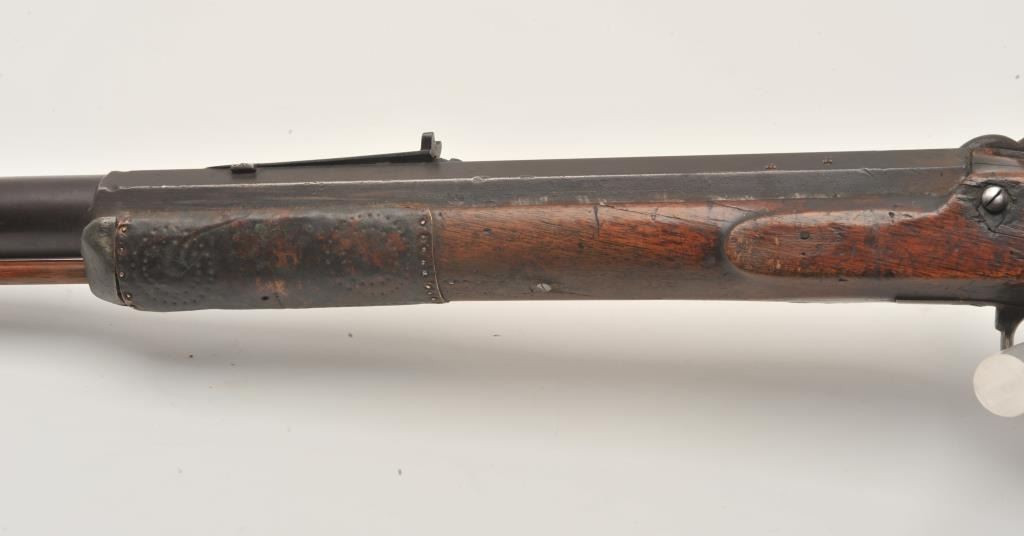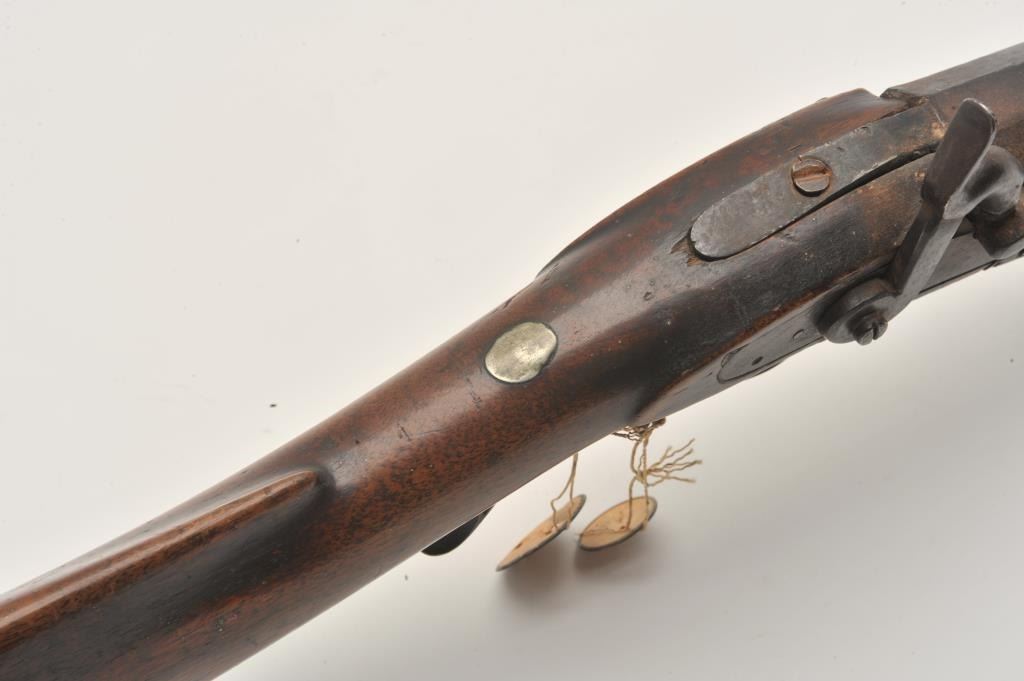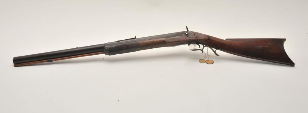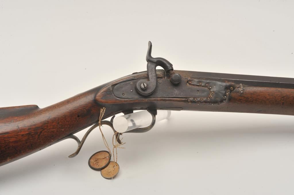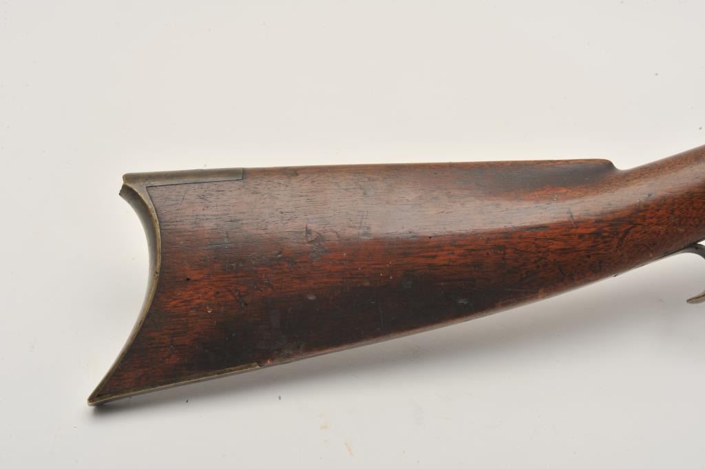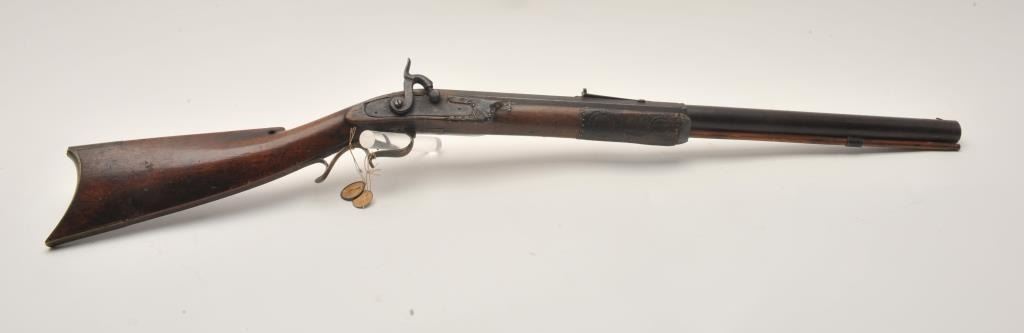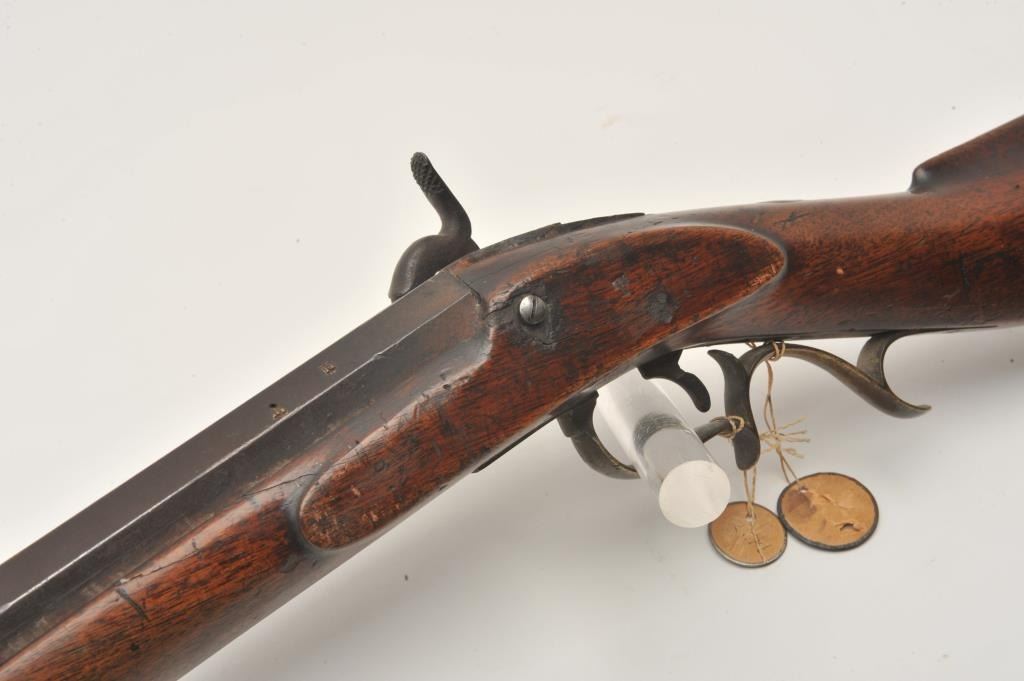 18EMY-21 INDIAN TACKED 1/2 STOCK PLAINSIndian tacked and decorated half stock percussion plains rifle, .41 caliber, half round/half octagon barrel marked “Wm Wingert/Detroit”, wood stock with “T” stamped on left side of stock above the trigger andon the left side of the butt stock; brass mounted and in un-cleaned condition with dark patina to metal surfaces. Originally in the Jonathan Tibbet (1822-1904) collection, an early Riverside, CA businessman who made hisfortune in the California Gold Rush in Placerville, later moving to Southern California. This rifle was part of his extensive artifact collection that the family later donated to the Claremont, CA. colleges museum. An early newspaper article (Xerox copy included) covers the opening of the display and stated “Articles of priceless value that can never be duplicated are included in the Collection. Famous musketsand pistols of noted western characters, pioneer relics, Indian baskets and weavings are but a few of the many cataloged articles”. (“T” stamps were noted as being on many of the collection’s firearms).Indian tacked and decorated half stock percussion plains rifle, .41 caliber, half round/half octagon barrel marked “Wm Wingert/Detroit”, wood stock with “T” stamped on left side of stock above the trigger andon the left side of the butt stock; brass mounted and in un-cleaned condition with dark patina to metal surfaces. Originally in the Jonathan Tibbet (1822-1904) collection, an early Riverside, CA businessman who made hisfortune in the California Gold Rush in Placerville, later moving to Southern California. This rifle was part of his extensive artifact collection that the family later donated to the Claremont, CA. colleges museum. An early newspaper article (Xerox copy included) covers the opening of the display and stated “Articles of priceless value that can never be duplicated are included in the Collection. Famous musketsand pistols of noted western characters, pioneer relics, Indian baskets and weavings are but a few of the many cataloged articles”. (“T” stamps were noted as being on many of the collection’s firearms).