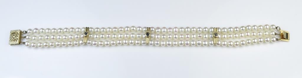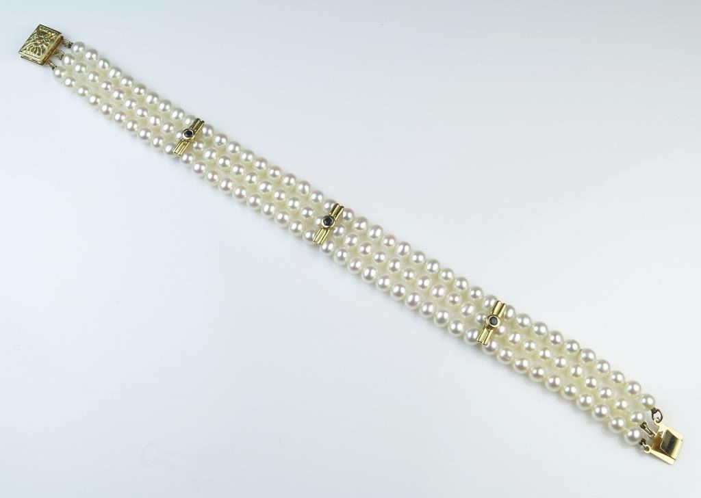 18CAI-13 PEARL BRACELETExtra Fine Pearl bracelet featuring three rows of round cultured Pearls averaging 4.50 MM in diameters of fine pink overtones with bezel set sapphires on 14 karat yellow gold links. Estimates $1,000-$1,500 NiceExtra Fine Pearl bracelet featuring three rows of round cultured Pearls averaging 4.50 MM in diameters of fine pink overtones with bezel set sapphires on 14 karat yellow gold links. Estimates $1,000-$1,500 Nice