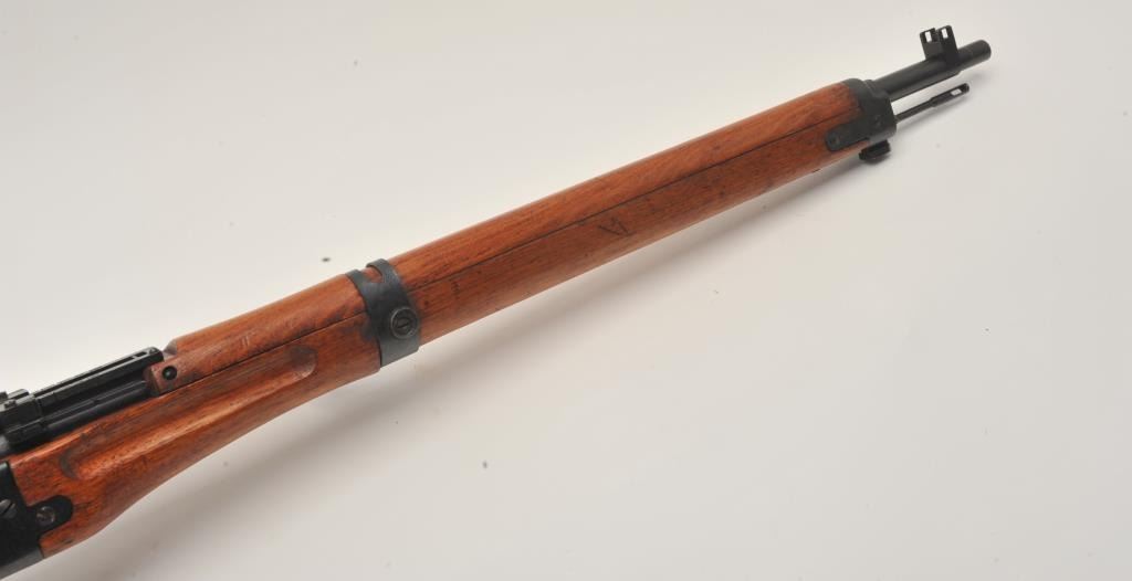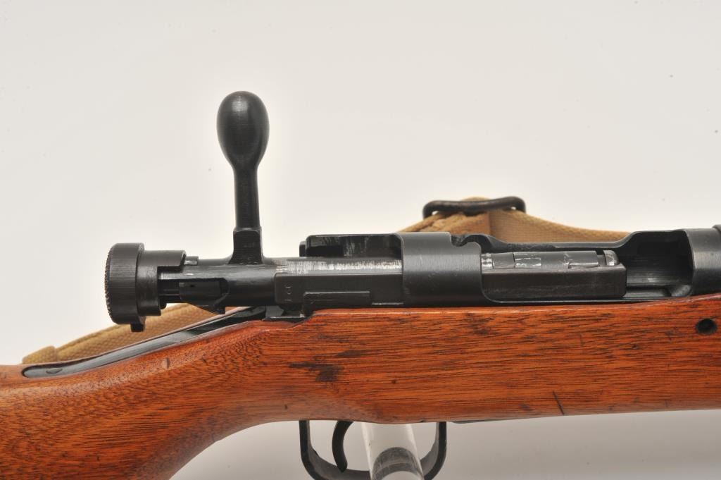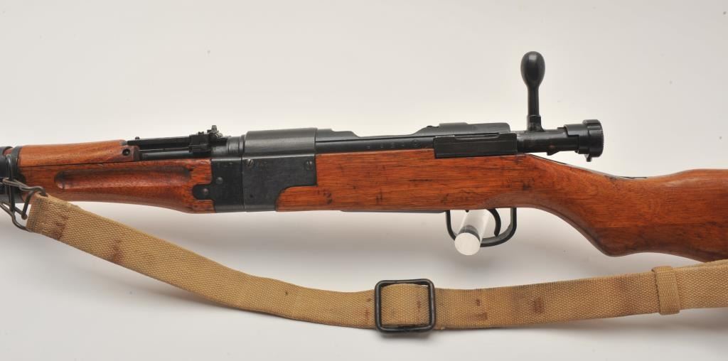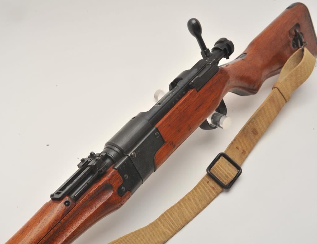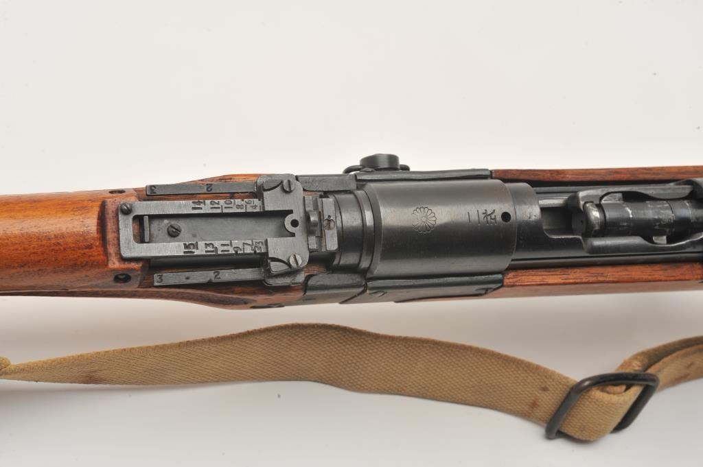 17MH-39 ARISAKA PARATROOPER #8924Scarce Japanese Arisaka Paratrooper Model bolt action rifle, 7.7mm caliber, blued finish, mum has been “touched” with old grind mark but still 90%+ visible, tan woven sling, S/N 8924, in overall very good to fine condition with majority of military finish to metal surfaces remaining, very good bore, crisp action, sharp markings and very good + wood stock. (C&R/PPT). Est.: $2,000-$4,000.Scarce Japanese Arisaka Paratrooper Model bolt action rifle, 7.7mm caliber, blued finish, mum has been “touched” with old grind mark but still 90%+ visible, tan woven sling, S/N 8924, in overall very good to fine condition with majority of military finish to metal surfaces remaining, very good bore, crisp action, sharp markings and very good + wood stock. (C&R/PPT). Est.: $2,000-$4,000.