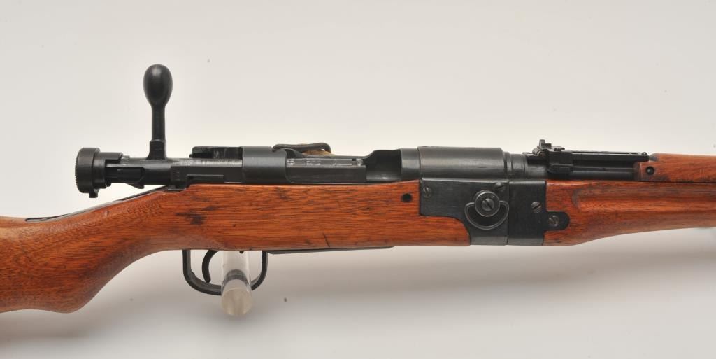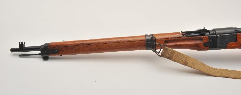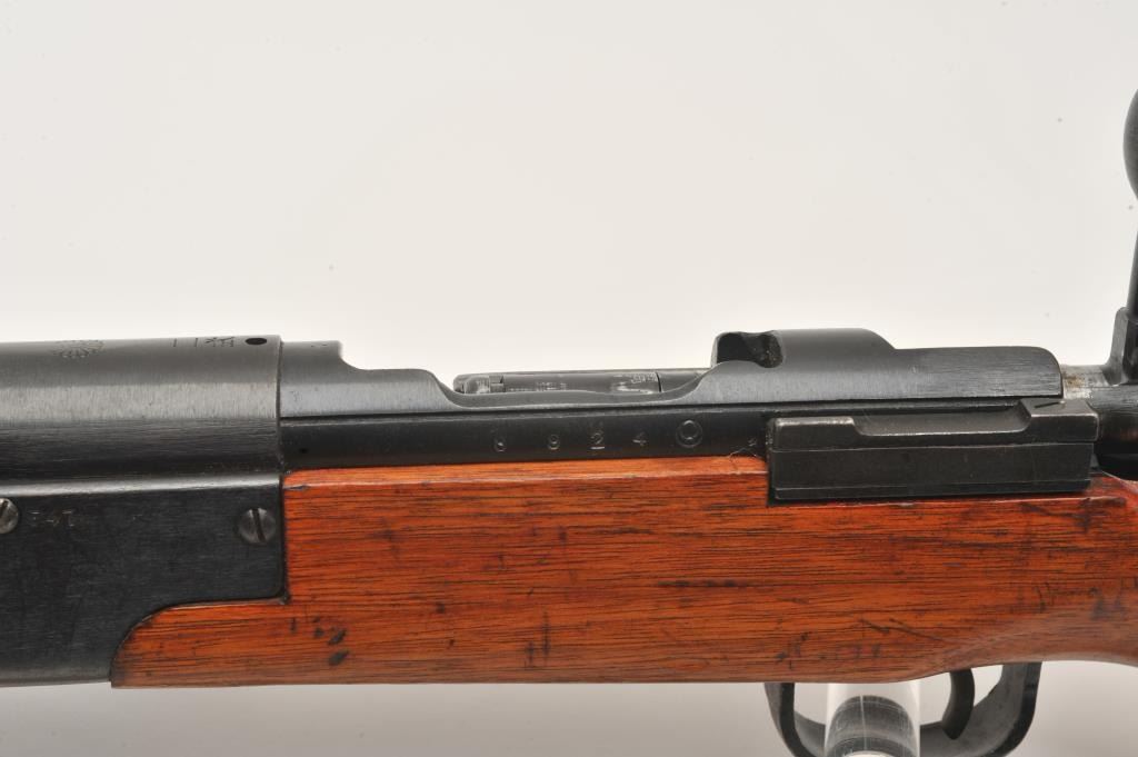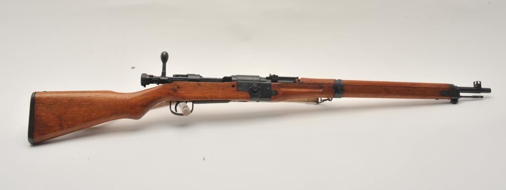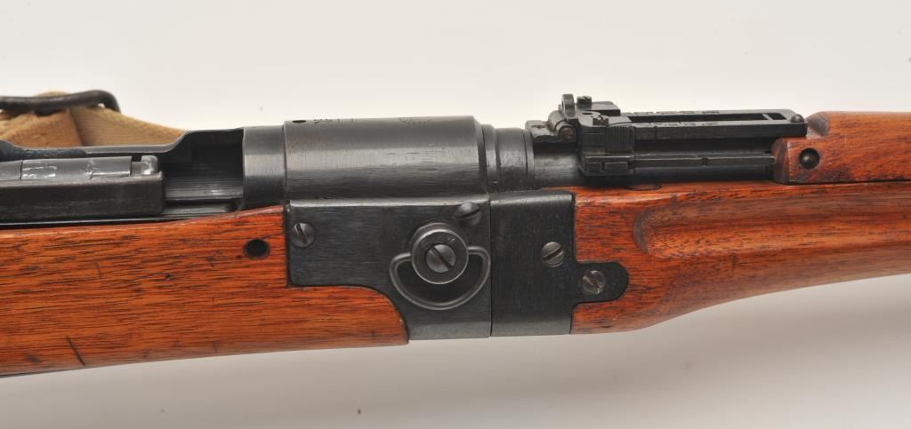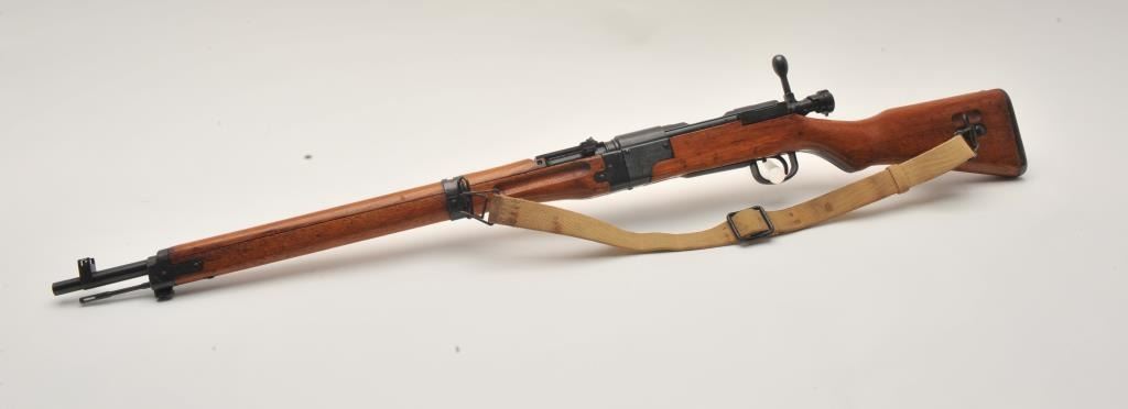 17MH-39 ARISAKA PARATROOPER #8924Scarce Japanese Arisaka Paratrooper Model bolt action rifle, 7.7mm caliber, blued finish, mum has been “touched” with old grind mark but still 90%+ visible, tan woven sling, S/N 8924, in overall very good to fine condition with majority of military finish to metal surfaces remaining, very good bore, crisp action, sharp markings and very good + wood stock. (C&R/PPT). Est.: $2,000-$4,000.Scarce Japanese Arisaka Paratrooper Model bolt action rifle, 7.7mm caliber, blued finish, mum has been “touched” with old grind mark but still 90%+ visible, tan woven sling, S/N 8924, in overall very good to fine condition with majority of military finish to metal surfaces remaining, very good bore, crisp action, sharp markings and very good + wood stock. (C&R/PPT). Est.: $2,000-$4,000.