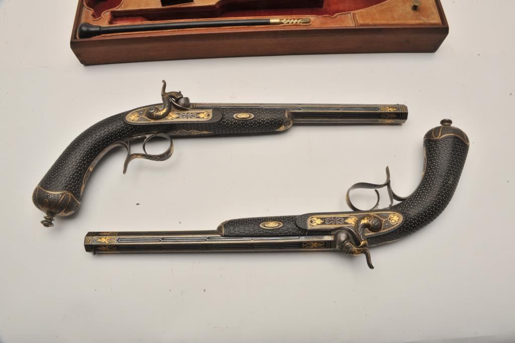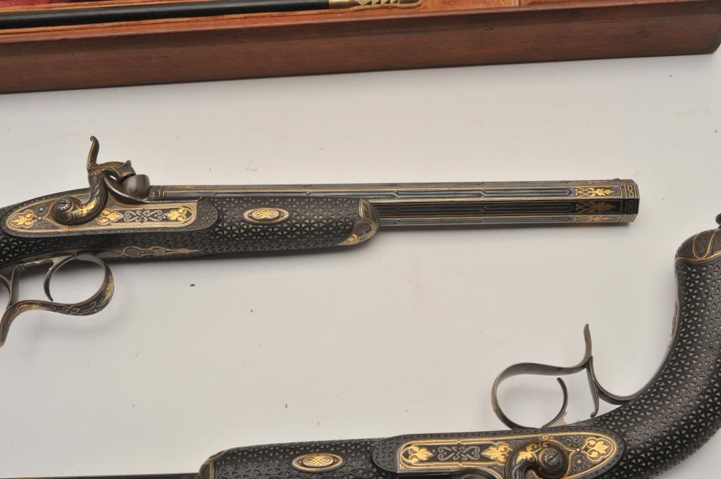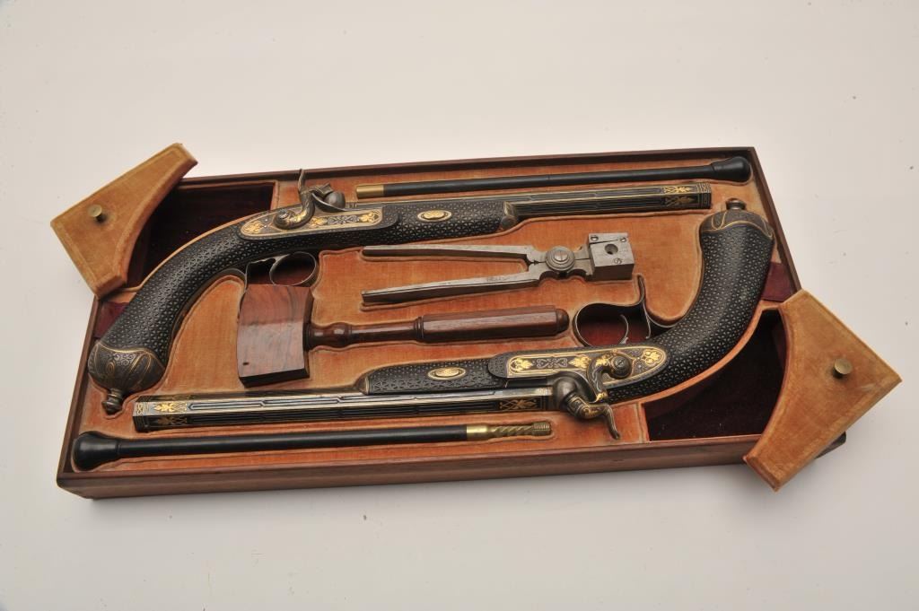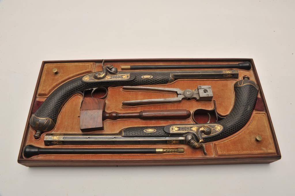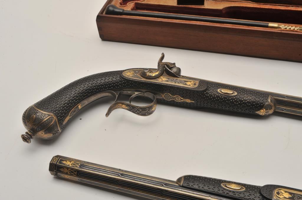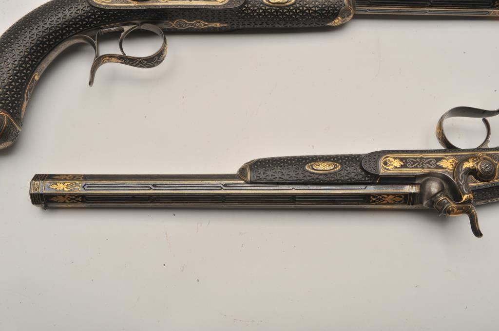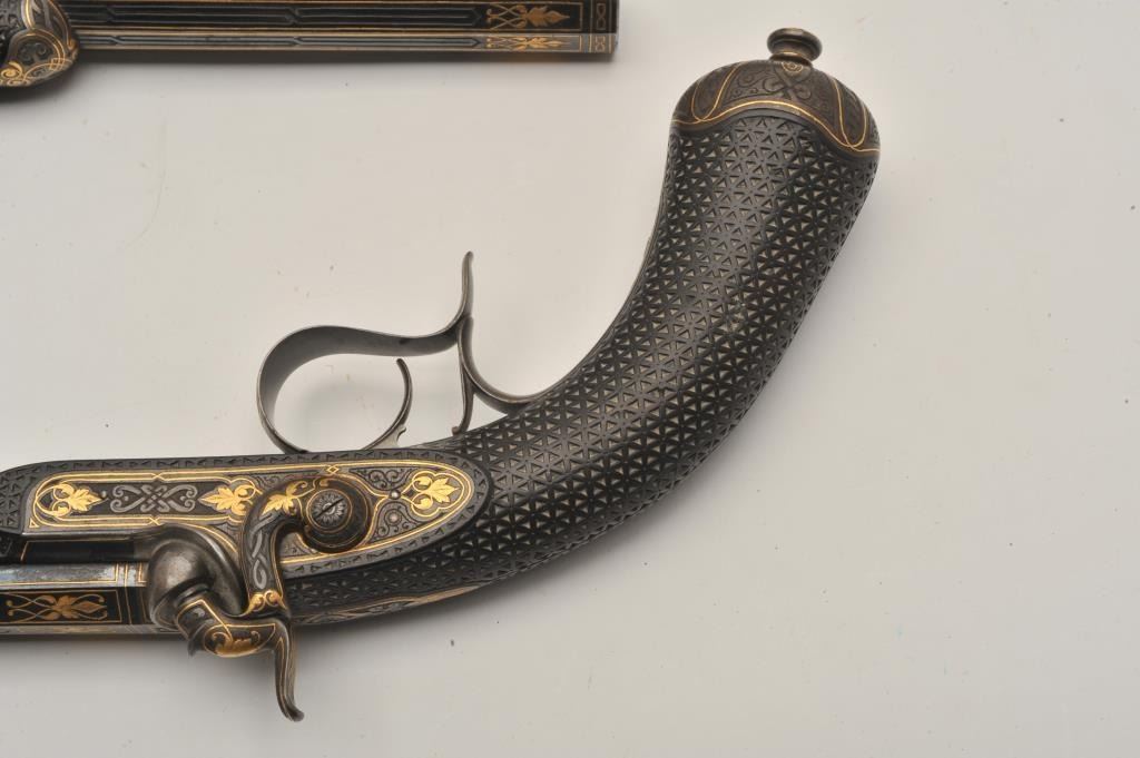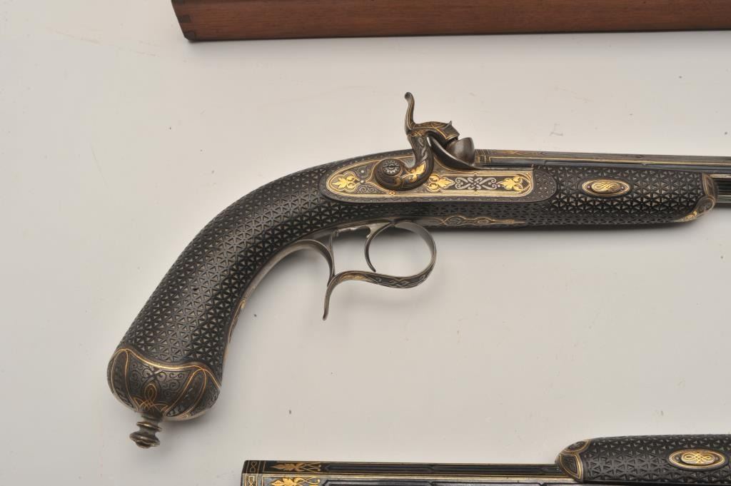 18AR-2 PAIR OF EXHIBITION QUALITY TGT/DUELERSSuperb exhibition quality pair of French dueling/target pistols in original case circa about 1850-60s. The pair show fine and ornate gold leaf and border inlays on the lock, hammers, barrels, and mounts. Thebackgrounds between gold are engraved and etched. The barrels are blued and the lock and mounts are case hardened and French gray satin finished. The stocks are finely arabesque pattern carved in ebony. Thecondition of the pair are fine to excellent. They measure 16 ½” overall with 10” barrels and .45 caliber rifled. Shows no evidence of firing or use. The pair are contained within the bottom half of their original Frenchstyle fitted case with mold, mallet, rods and covered compartments. The interior material is faded but near fine condition. The mold is unused and correct size. It is our opinion this pair lifted out of a larger outer casethat was either damaged or lost and may have contained additional shooting accessories. A superbly decorated pair that may be signed inside locks or under the barrels however we did not risk disassembly. (Antique) Est.:Superb exhibition quality pair of French dueling/target pistols in original case circa about 1850-60s. The pair show fine and ornate gold leaf and border inlays on the lock, hammers, barrels, and mounts. Thebackgrounds between gold are engraved and etched. The barrels are blued and the lock and mounts are case hardened and French gray satin finished. The stocks are finely arabesque pattern carved in ebony. Thecondition of the pair are fine to excellent. They measure 16 ½” overall with 10” barrels and .45 caliber rifled. Shows no evidence of firing or use. The pair are contained within the bottom half of their original Frenchstyle fitted case with mold, mallet, rods and covered compartments. The interior material is faded but near fine condition. The mold is unused and correct size. It is our opinion this pair lifted out of a larger outer casethat was either damaged or lost and may have contained additional shooting accessories. A superbly decorated pair that may be signed inside locks or under the barrels however we did not risk disassembly. (Antique) Est.: