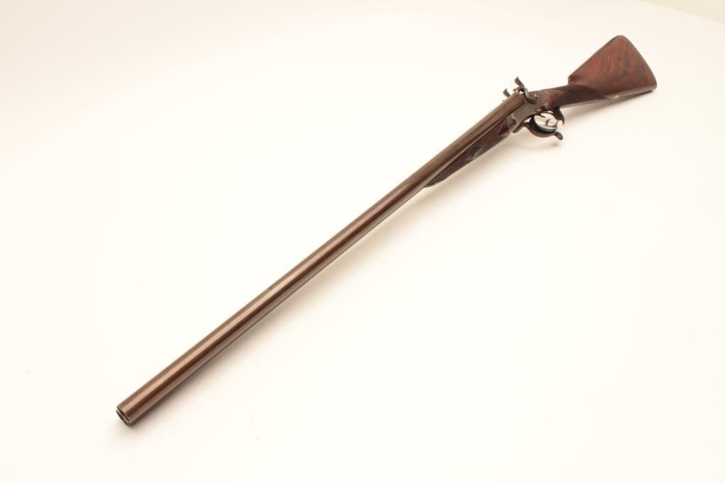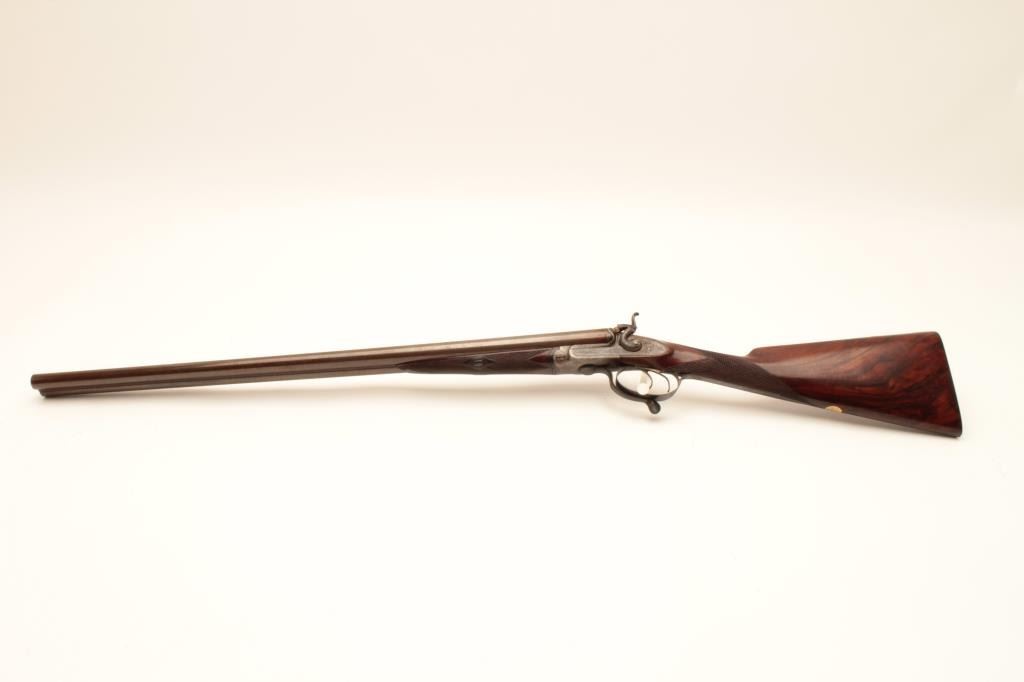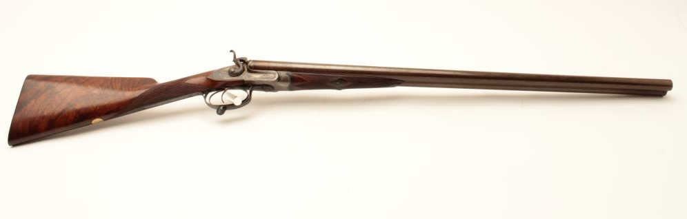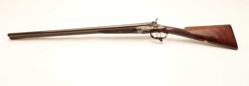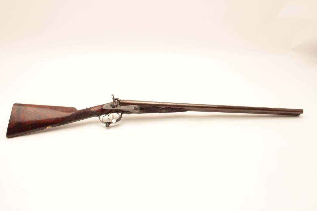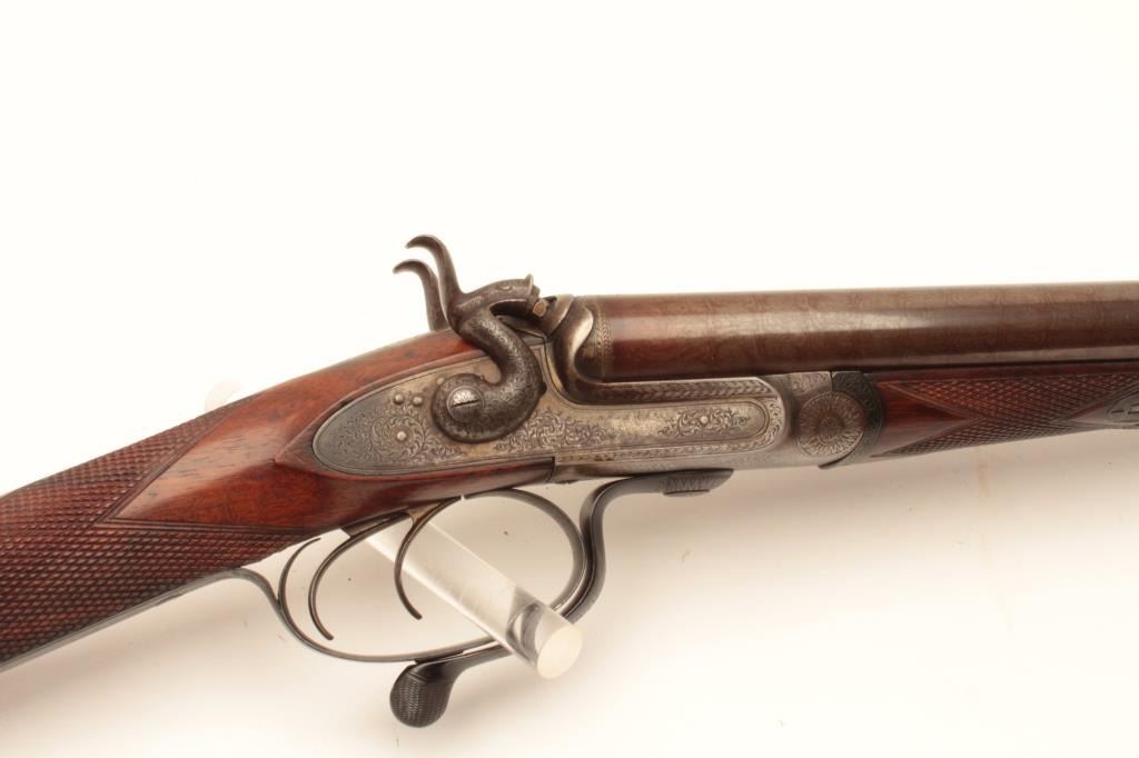 18AR-3 PAIR OF BOSS SHOTGUNSPair of “Boss & Co., London” side lock exposed hammer and under lever Damascus barrel sporting shotguns, S/N 1080 & 1081 also numbered 1 and 2 on the tangs indicating a true pair. Owners plaques show engravedcrest possibly Royal (Serpent with septer in castle turret with 3 pointed crown over cross and on bar).The pair are in 10GA and measure 45 ¾” overall with 29 ½” barrels and 14 ¼” from front trigger to the butt plate. Bestquality scroll engraved locks with dogs on the trigger guards. Nicely checkered burl wood stocks with fancy engraved butt showing game birds. Showing fine quality English refurbish with 90% plus tobacco brown ondamascened barrels, 50%-60% light original case colors, 95% plus refurbished blue on the trigger guards and butt plates. Very good and bright bores with good actions and tight lock up. Boss and Purdey considered “TheBest” of best London makers but pairs of Boss guns are SUPER RARE. (Antique) Est.: $9,000-$18,000Pair of “Boss & Co., London” side lock exposed hammer and under lever Damascus barrel sporting shotguns, S/N 1080 & 1081 also numbered 1 and 2 on the tangs indicating a true pair. Owners plaques show engravedcrest possibly Royal (Serpent with septer in castle turret with 3 pointed crown over cross and on bar).The pair are in 10GA and measure 45 ¾” overall with 29 ½” barrels and 14 ¼” from front trigger to the butt plate. Bestquality scroll engraved locks with dogs on the trigger guards. Nicely checkered burl wood stocks with fancy engraved butt showing game birds. Showing fine quality English refurbish with 90% plus tobacco brown ondamascened barrels, 50%-60% light original case colors, 95% plus refurbished blue on the trigger guards and butt plates. Very good and bright bores with good actions and tight lock up. Boss and Purdey considered “TheBest” of best London makers but pairs of Boss guns are SUPER RARE. (Antique) Est.: $9,000-$18,000