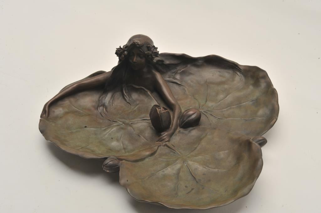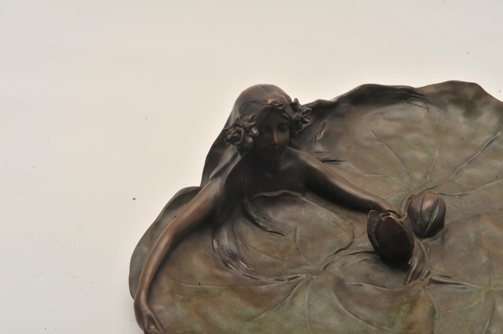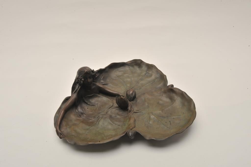 EVE-50 BRONZEAuthentic art neveaux period bronze of lady in leaf with flowers and signed Raquel Larche. Measures 13 ½” across by 4” tall. The estate of Eric Vaule. Est.: $1000-$2000Authentic art neveaux period bronze of lady in leaf with flowers and signed Raquel Larche. Measures 13 ½” across by 4” tall. The estate of Eric Vaule. Est.: $1000-$2000