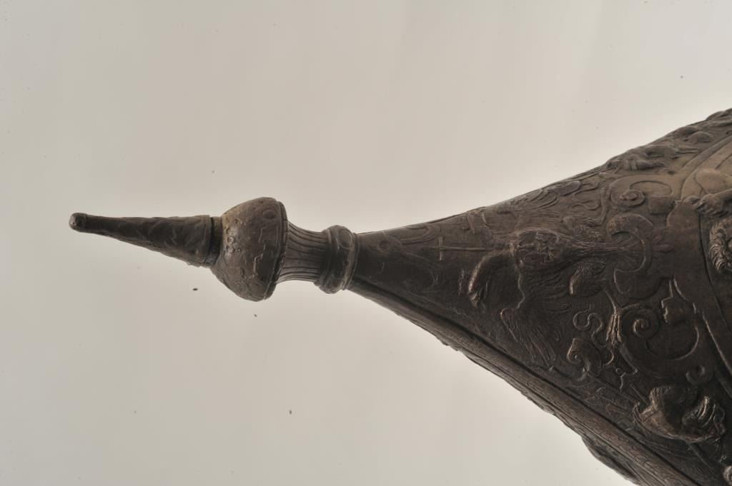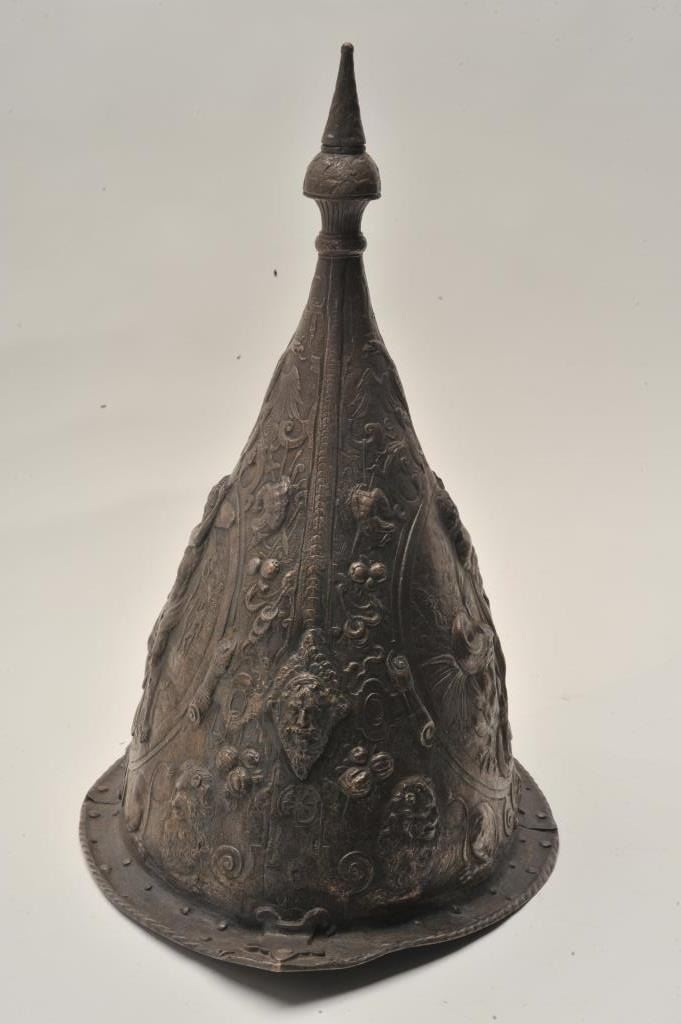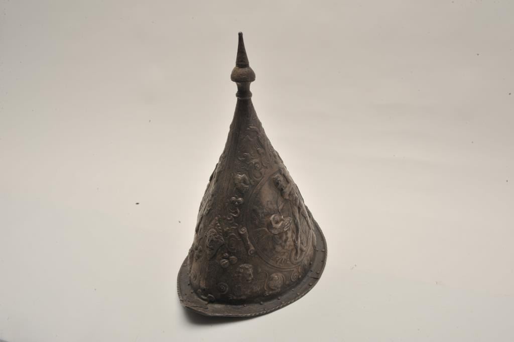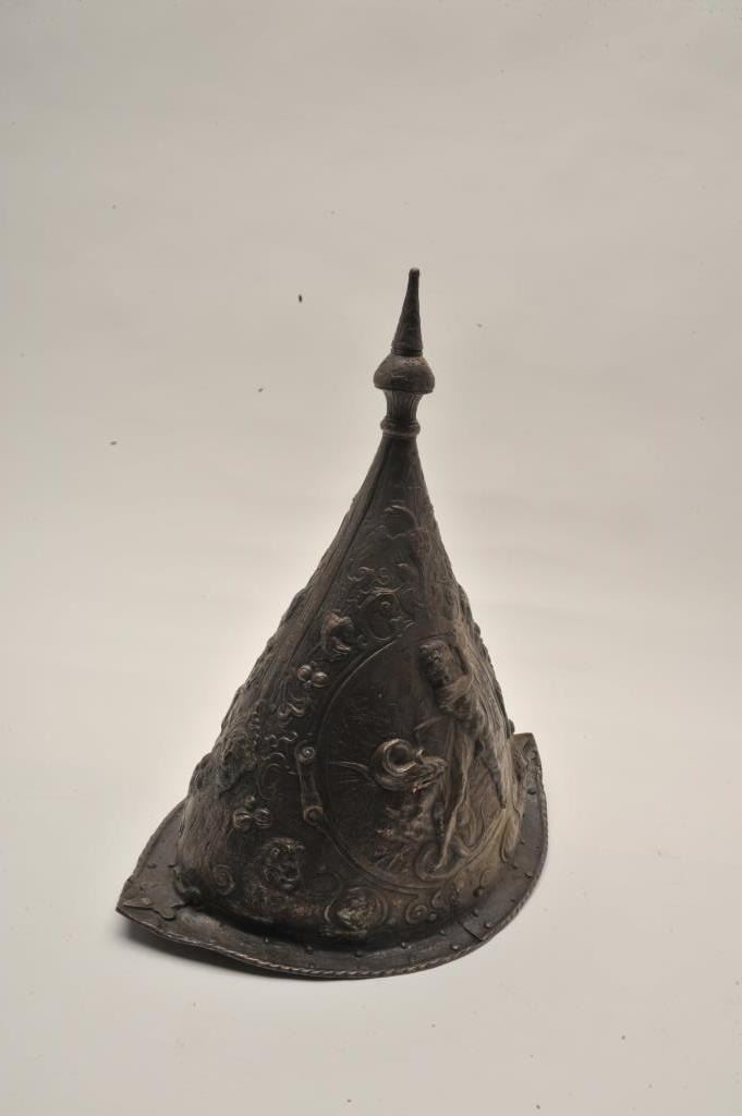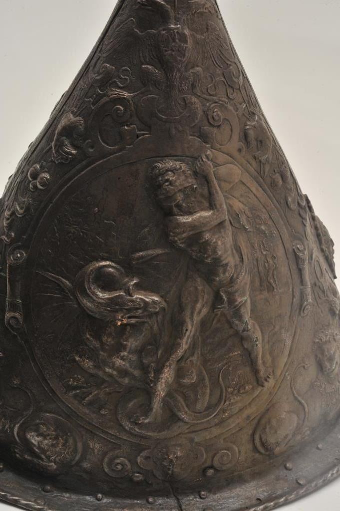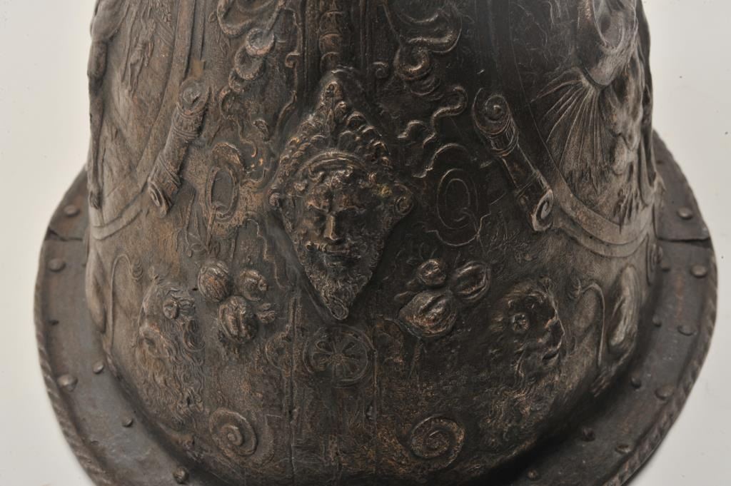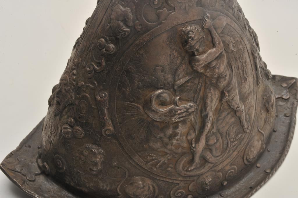 EVE-76 ELKINGTON HELMETGood Elkington helmet in Russian style showing good detail and darkened patina. Shows “VR” marking in the rim with collection marking. Mid-19th century museum copy of famous helmet purportedly Peter the Great.Scenes of Hercules slaying beast. Only of this style we have encountered. The estate of Eric Vaule. Est.: $2500-$5000Good Elkington helmet in Russian style showing good detail and darkened patina. Shows “VR” marking in the rim with collection marking. Mid-19th century museum copy of famous helmet purportedly Peter the Great.Scenes of Hercules slaying beast. Only of this style we have encountered. The estate of Eric Vaule. Est.: $2500-$5000