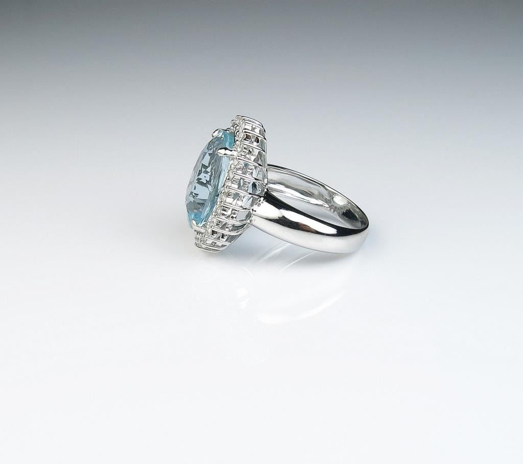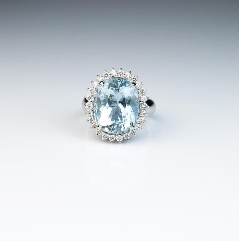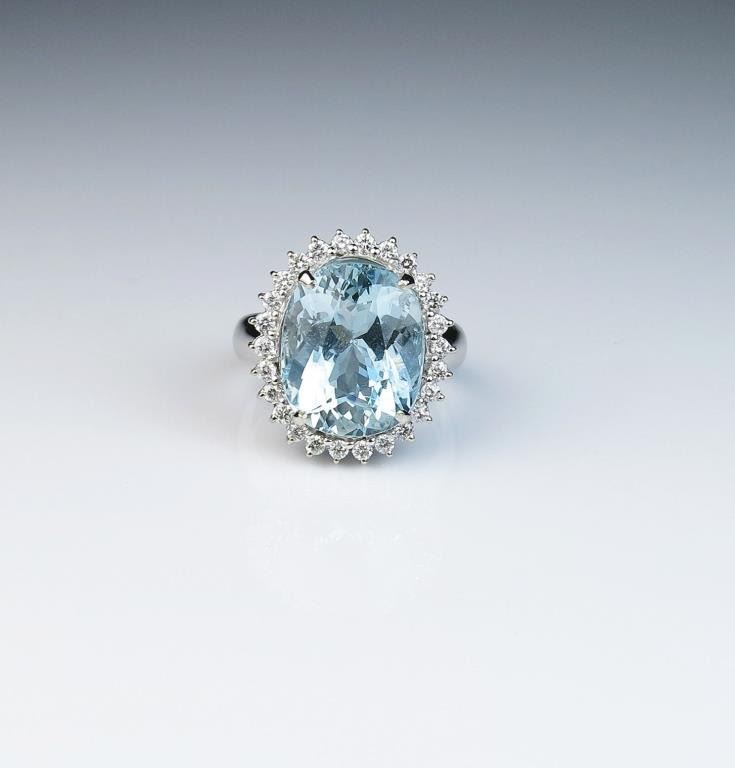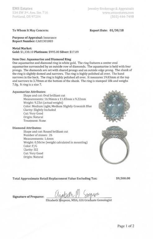 18CAI-5 AQUAMARINE & DIAMOND RINGCaptivating Princess Diana style ring featuring an oval blue Aquamarine weighing approx. 9.00 carats and surrounded by 26 round Diamonds weighing approx. 0.70 carats of F-G colors and SI clarity set in a 14karat white gold custom setting. Appraised at $9,500.00 Estimates $3,000-$4,000Captivating Princess Diana style ring featuring an oval blue Aquamarine weighing approx. 9.00 carats and surrounded by 26 round Diamonds weighing approx. 0.70 carats of F-G colors and SI clarity set in a 14karat white gold custom setting. Appraised at $9,500.00 Estimates $3,000-$4,000