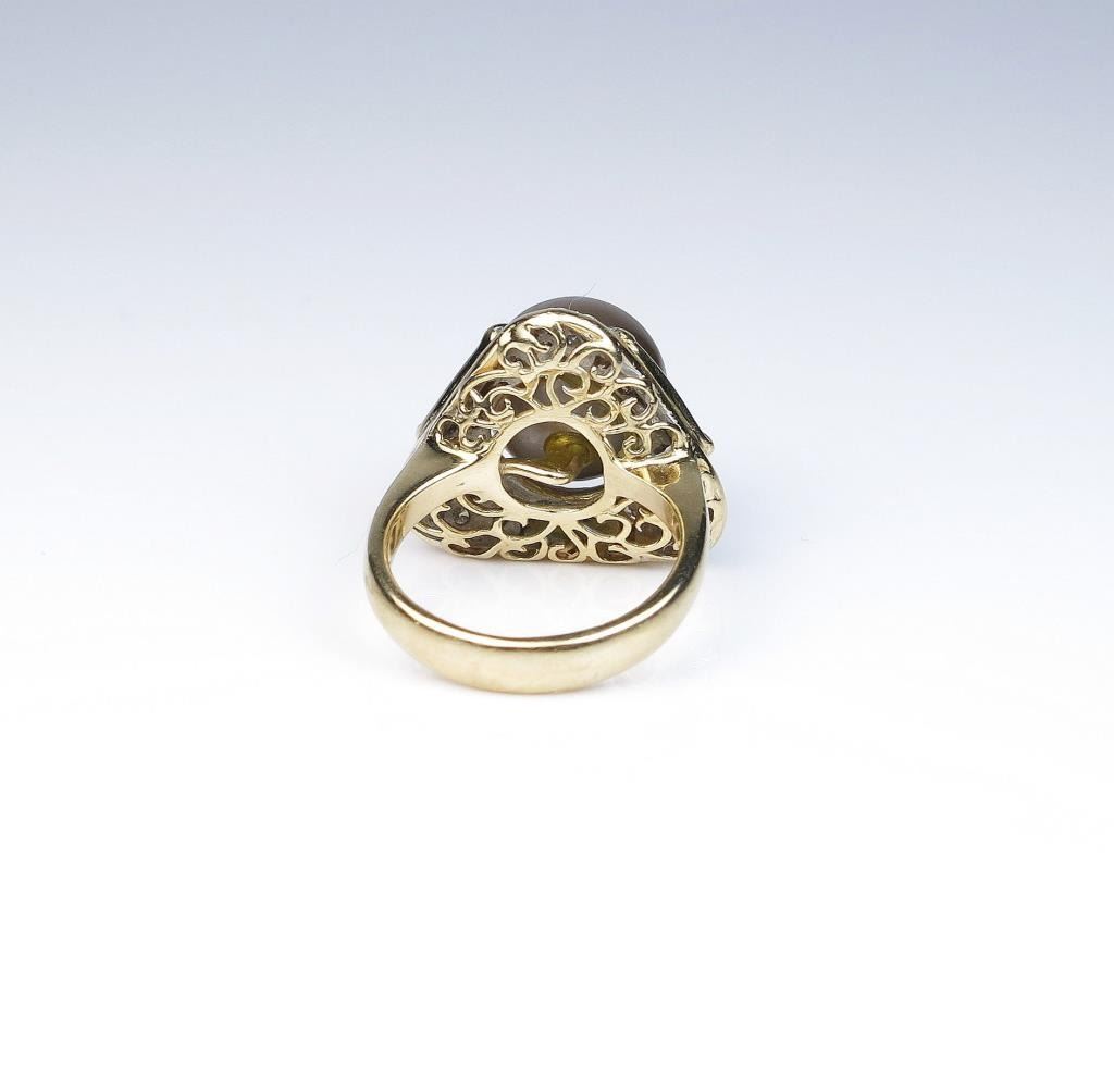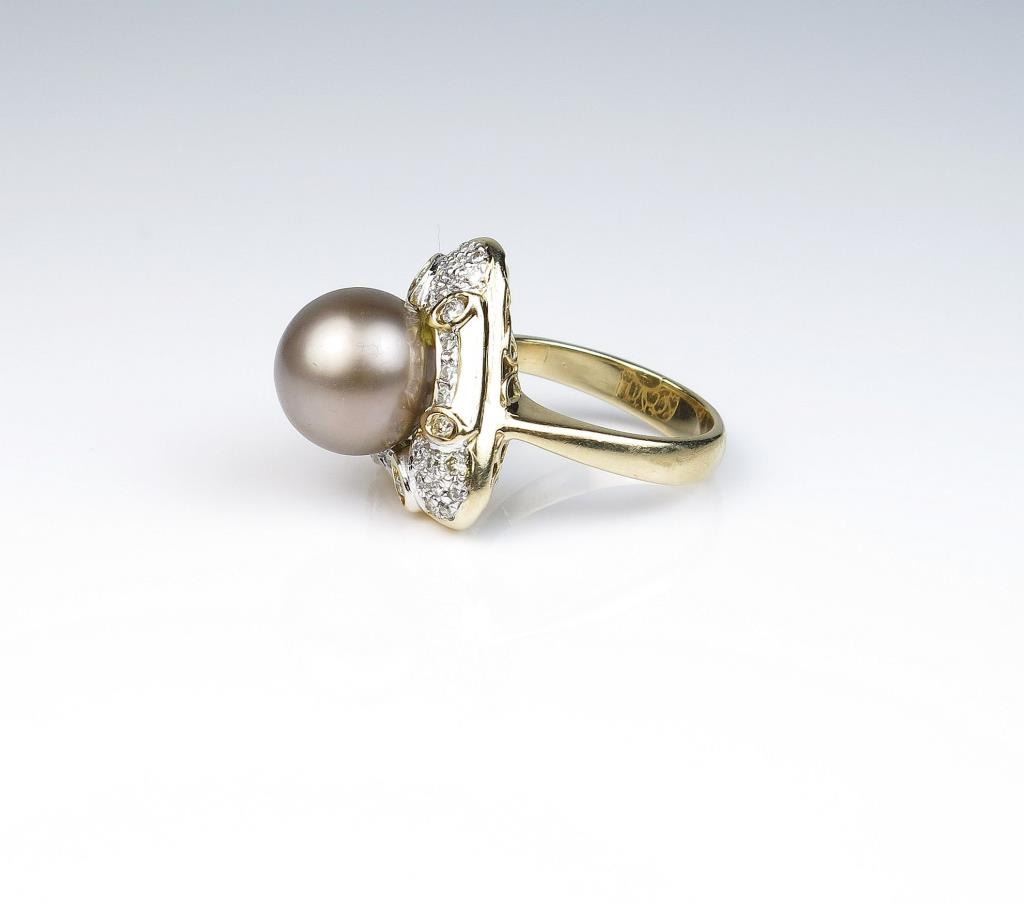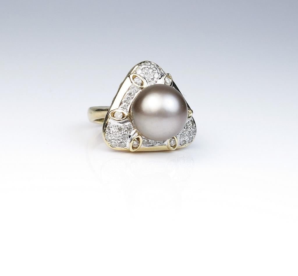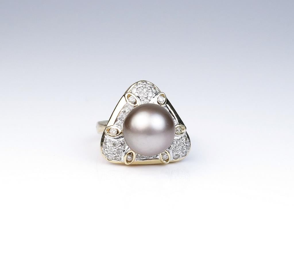 18CAI-11 TAHITIAN PEARL RINGElegant ring featuring a round Black Tahitian South Sea pearl and fine set with 40 round Diamonds weighing approx. 1.00 carat of G-H colors and SI clarity set in an 18 karat yellow gold custom made setting. Estimates$2,000-$3,000Elegant ring featuring a round Black Tahitian South Sea pearl and fine set with 40 round Diamonds weighing approx. 1.00 carat of G-H colors and SI clarity set in an 18 karat yellow gold custom made setting. Estimates$2,000-$3,000