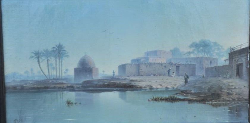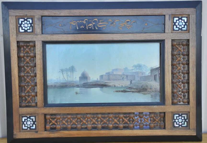 EVE-29 OIL ON CANVASExcellent oil on canvas in orientalist style signed lower left “T.P. 90” (1890?) Great carved and inlaid frame of the same period. Measures 6 ½” x 12”. Minor damage and paint loss at edges. Eric Vaule thought to beCairo. The estate of Eric Vaule. Est.: $1500-$3000Excellent oil on canvas in orientalist style signed lower left “T.P. 90” (1890?) Great carved and inlaid frame of the same period. Measures 6 ½” x 12”. Minor damage and paint loss at edges. Eric Vaule thought to beCairo. The estate of Eric Vaule. Est.: $1500-$3000