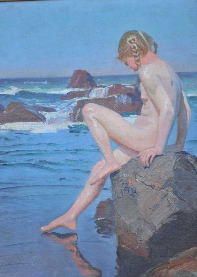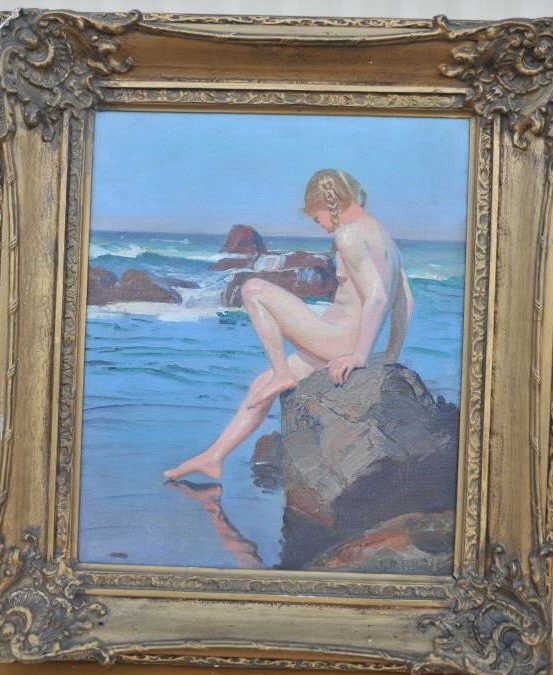 EVE-35 OIL ON CANVASOil on canvas signed lower right in long illegible signature. Shows young nude at coastline on rock. Very well done. Measures approximately 19 ¾” x 16 ¼” (See Appraisal). The estate of Eric Vaule. Est.: $1500-$3000Oil on canvas signed lower right in long illegible signature. Shows young nude at coastline on rock. Very well done. Measures approximately 19 ¾” x 16 ¼” (See Appraisal). The estate of Eric Vaule. Est.: $1500-$3000