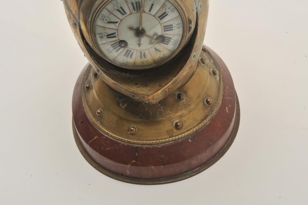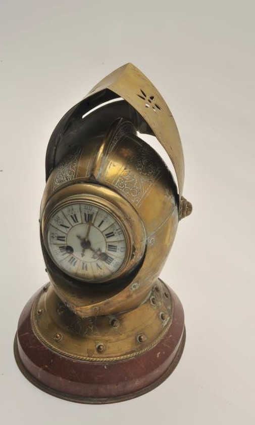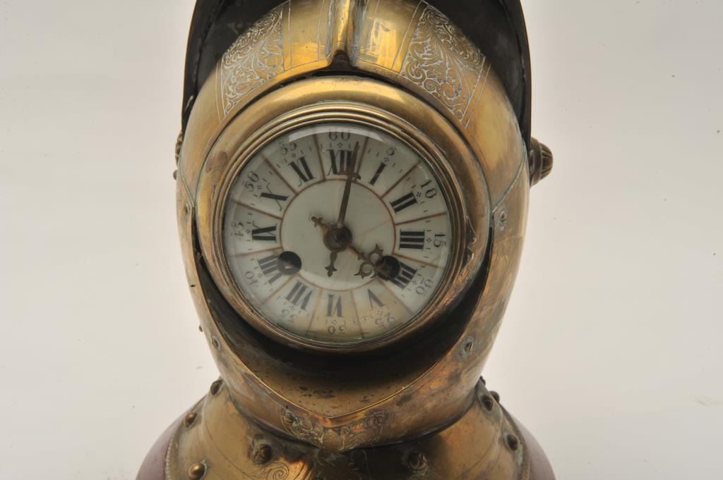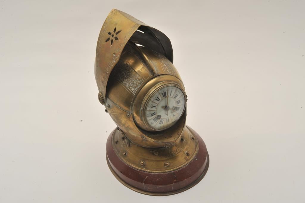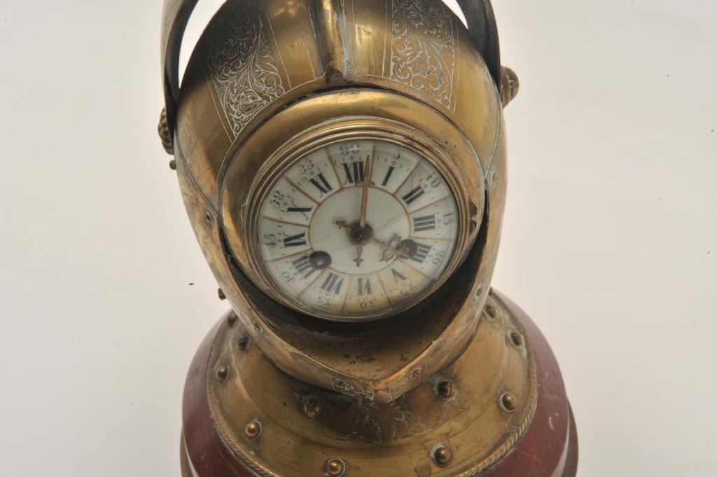 EVE-74 ARMORAL HELMET¾” size armoral helmet constructed of engraved brass on marble with concealed clock within. The clock shows porcelain face and two key wind (Chimes). The movement appears clean and intact but no key to wind. Mid-19th century European probably English. Est.: $800-$1600¾” size armoral helmet constructed of engraved brass on marble with concealed clock within. The clock shows porcelain face and two key wind (Chimes). The movement appears clean and intact but no key to wind. Mid-19th century European probably English. Est.: $800-$1600