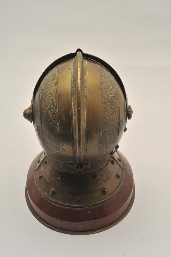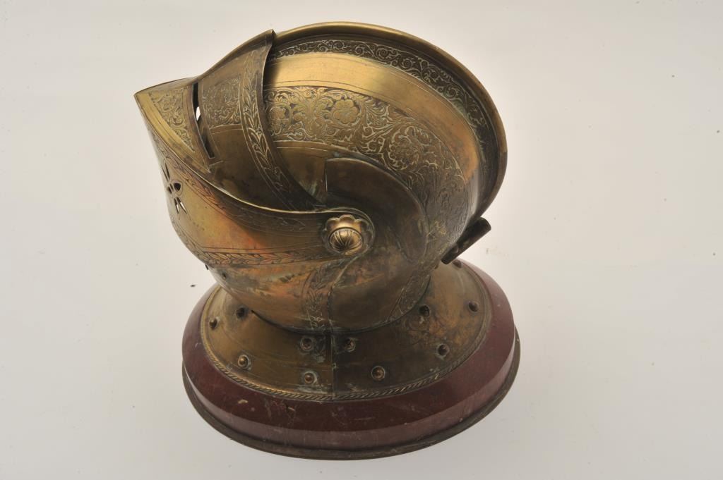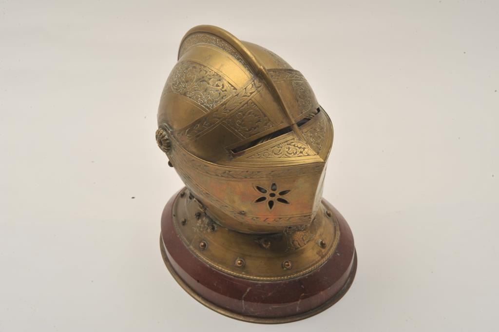 Lot 135 EVE-74 ARMORAL HELMET¾” size armoral helmet constructed of engraved brass on marble with concealed