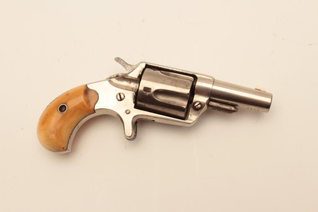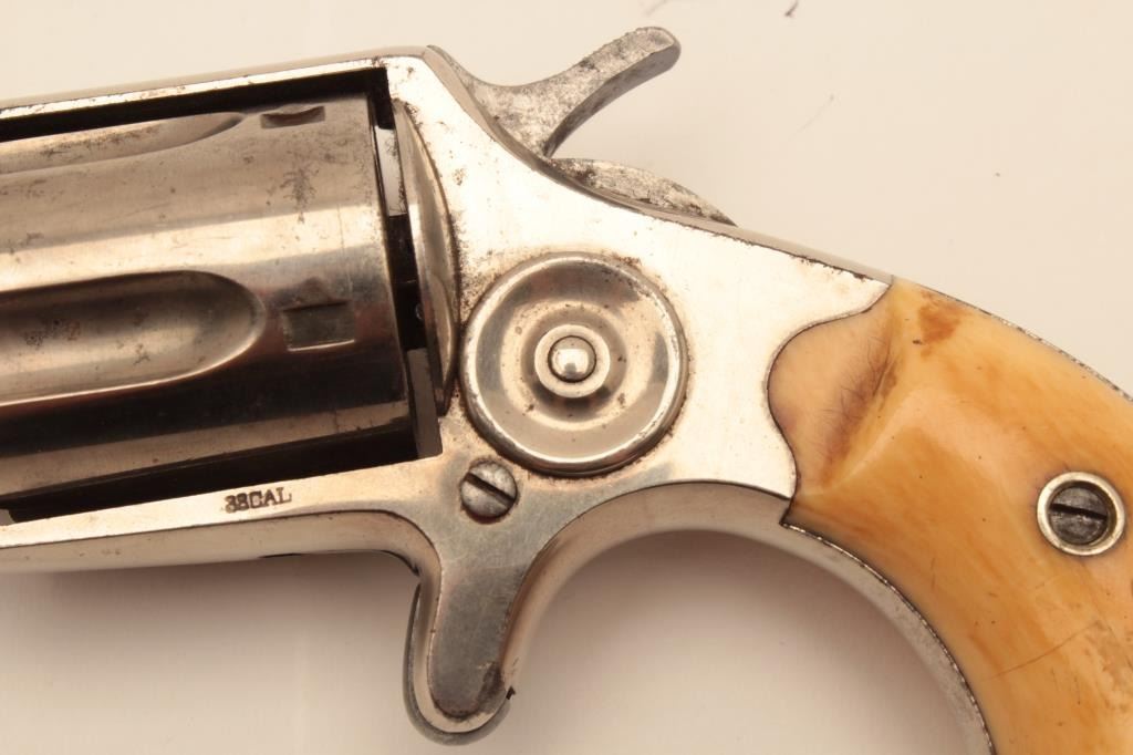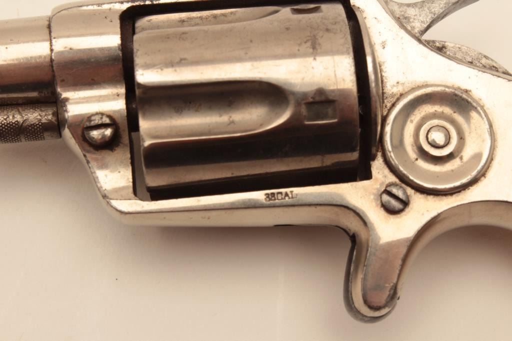 18CF-3 COLT NEW LINEColt New Line .38 caliber revolver nickel plated with authentic period ivory grips, S/N 1723. 75%-85% original lightly polished nickel finish remains with “Colt New .38” etched panel visible byt light. Bright blueon the back of the hammer. Great fit and patina to the original grips. Works well and tight. (Antique) Est.: $900-$1800Colt New Line .38 caliber revolver nickel plated with authentic period ivory grips, S/N 1723. 75%-85% original lightly polished nickel finish remains with “Colt New .38” etched panel visible byt light. Bright blueon the back of the hammer. Great fit and patina to the original grips. Works well and tight. (Antique) Est.: $900-$1800