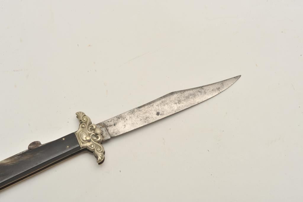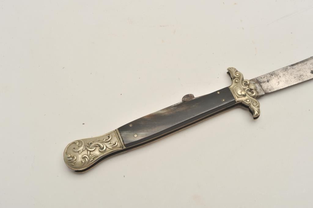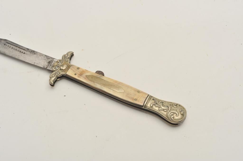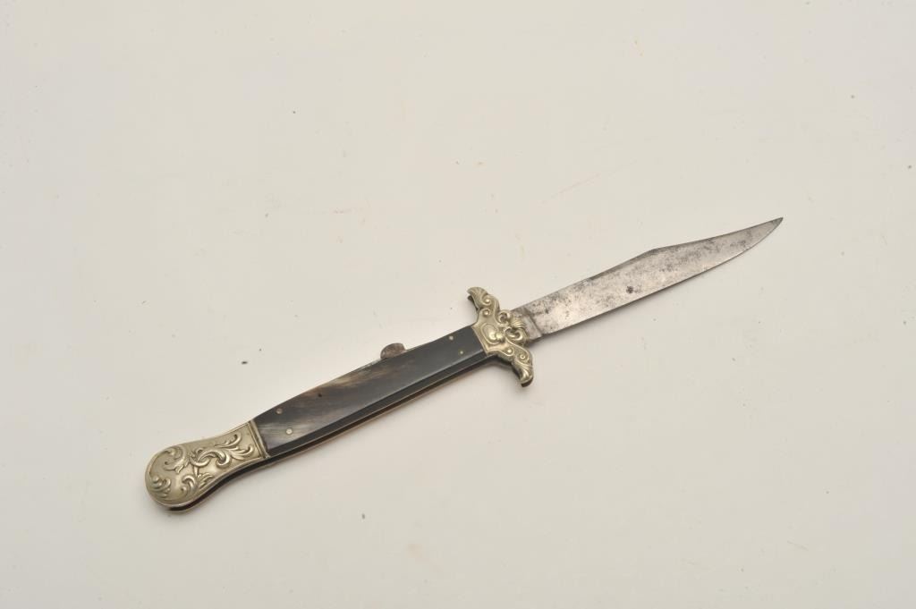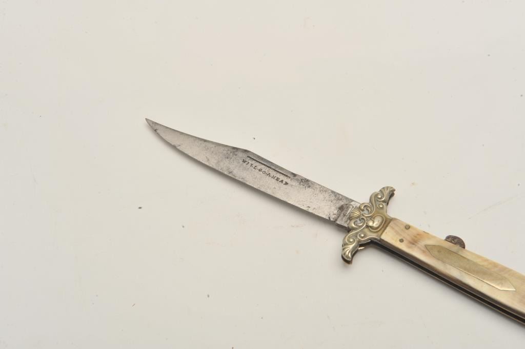 18CF-10 FOLDINGEnglish Mid-19th century folding lock blade knife marked “Elward, Barnes, & Co” with “Will-Go-A-Head” logo on the blade. Measures 9 7/8” overall with a 4 ½” clipped point blade, fancy stamped German silver mounts,and dark horn grip. Good condition with minor pitting and slight sharpening. Scarce maker and logo. About gold rush era. Est.: $900-$1800English Mid-19th century folding lock blade knife marked “Elward, Barnes, & Co” with “Will-Go-A-Head” logo on the blade. Measures 9 7/8” overall with a 4 ½” clipped point blade, fancy stamped German silver mounts,and dark horn grip. Good condition with minor pitting and slight sharpening. Scarce maker and logo. About gold rush era. Est.: $900-$1800