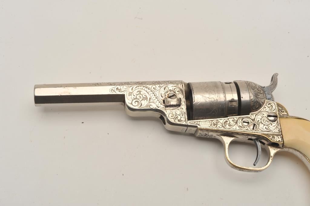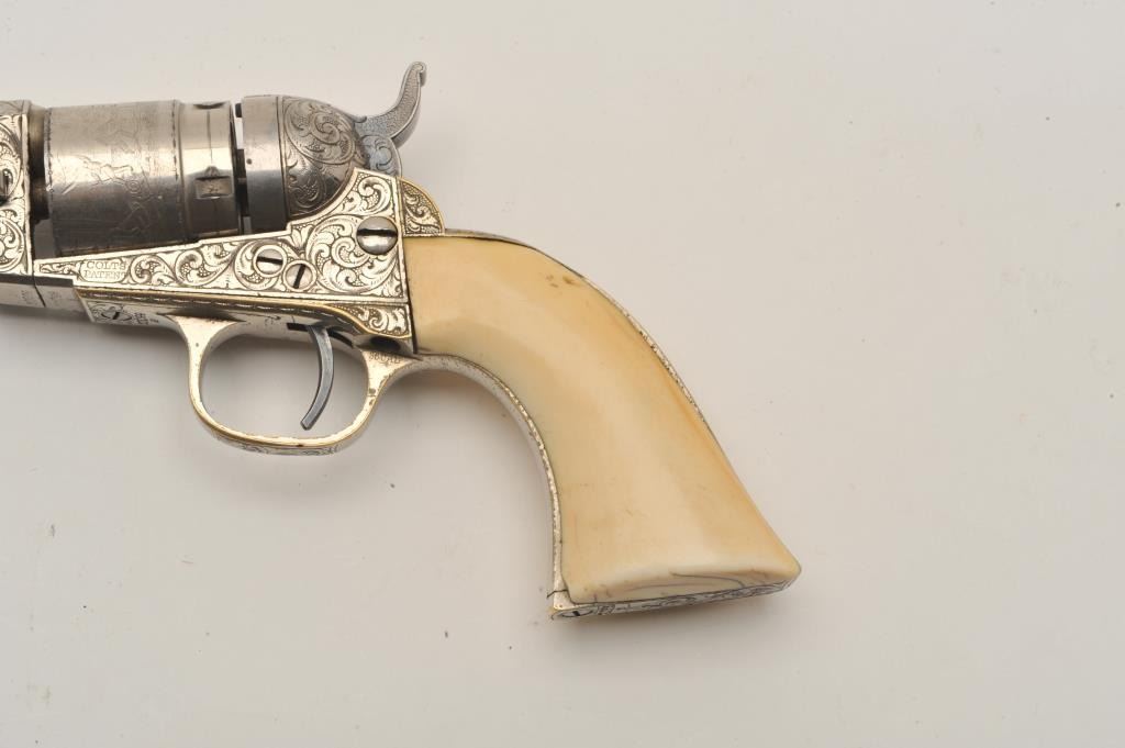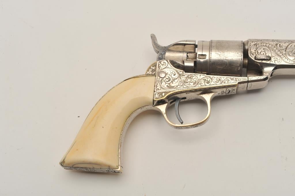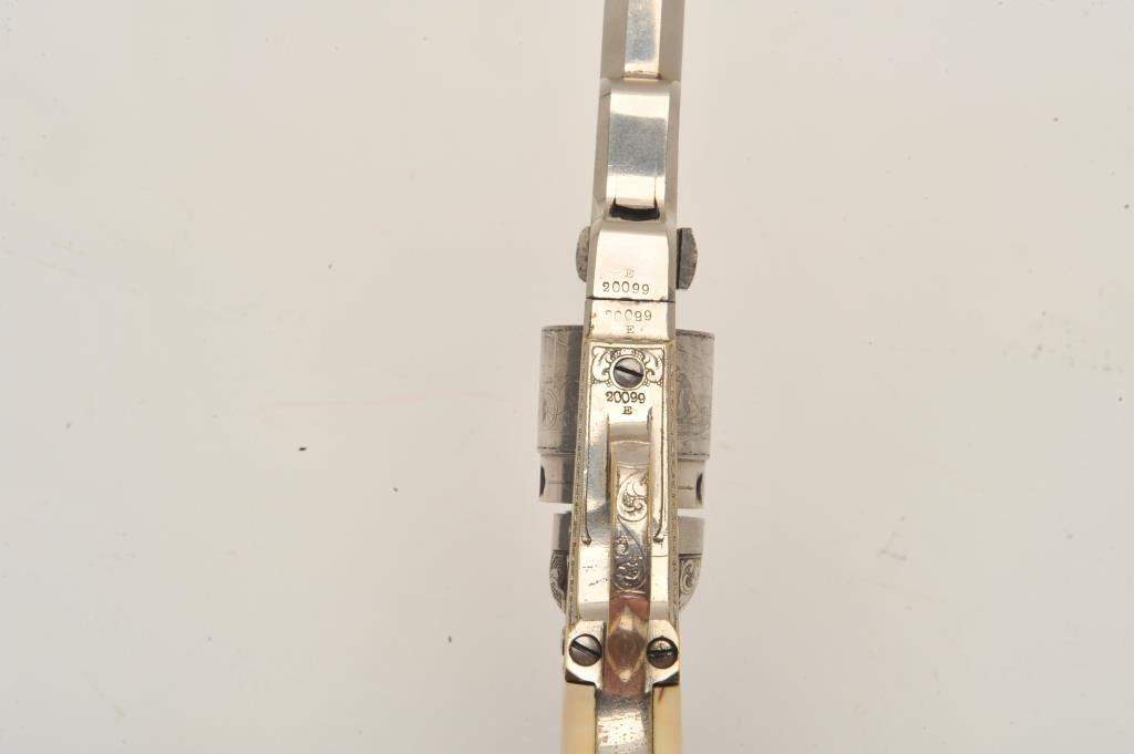 18BD-3 FACTORY ENGRAVED POCKET NAVY CONVColt Pocket Navy Conversion to .38 Rim-fire with a 4 ½” barrel, factory engraved, and nickel plated with authentic ivory grips, S/N E 20099. This revolver shows 90%-95% original nickel from the time of theconversion to cartridge. The markings are sharp. The grips are very good with small chips to the left toe. All matching visible numbers. 80%-90% stage coach scene with good markings. Bright blue on firing pin withvibrant case colors on the hammer. A few small scratches and nicks. “The Colt Engraving Book” Volume 1 pictures similar example and lists thei serial number. (Antique) Est.: $5,000-$10,000Colt Pocket Navy Conversion to .38 Rim-fire with a 4 ½” barrel, factory engraved, and nickel plated with authentic ivory grips, S/N E 20099. This revolver shows 90%-95% original nickel from the time of theconversion to cartridge. The markings are sharp. The grips are very good with small chips to the left toe. All matching visible numbers. 80%-90% stage coach scene with good markings. Bright blue on firing pin withvibrant case colors on the hammer. A few small scratches and nicks. “The Colt Engraving Book” Volume 1 pictures similar example and lists thei serial number. (Antique) Est.: $5,000-$10,000
