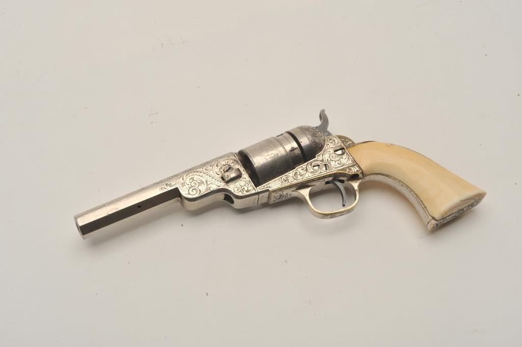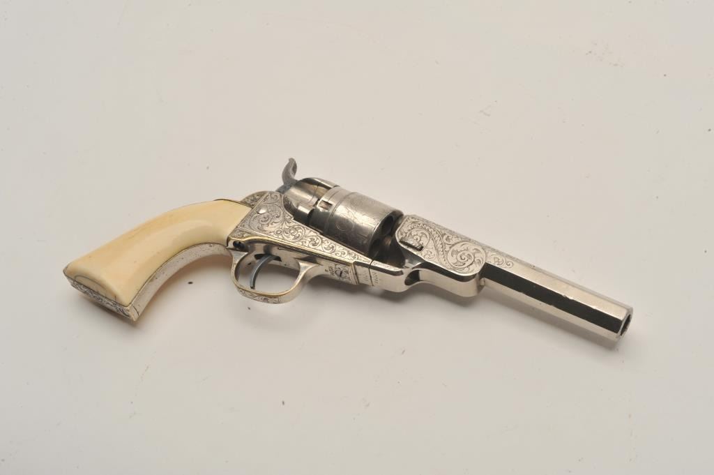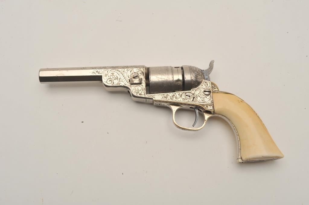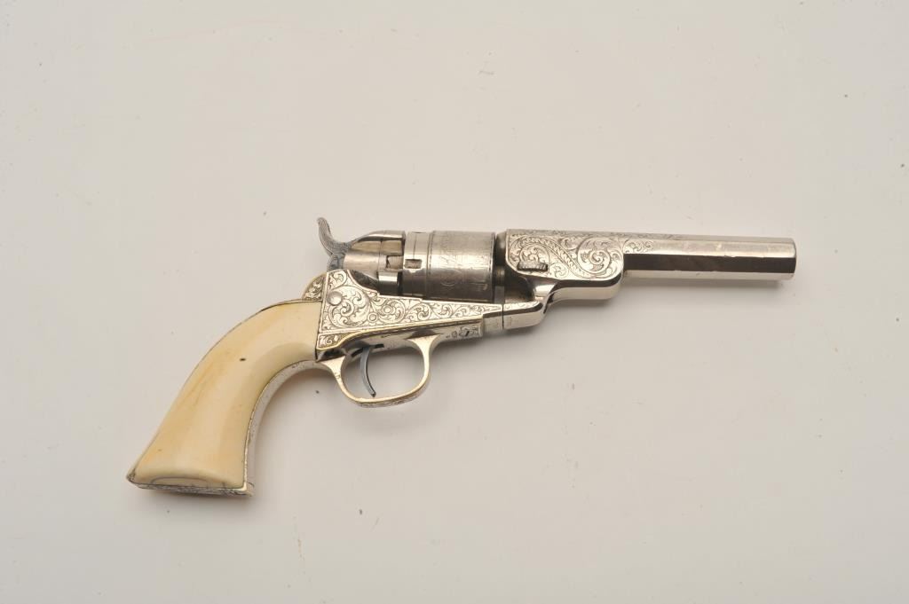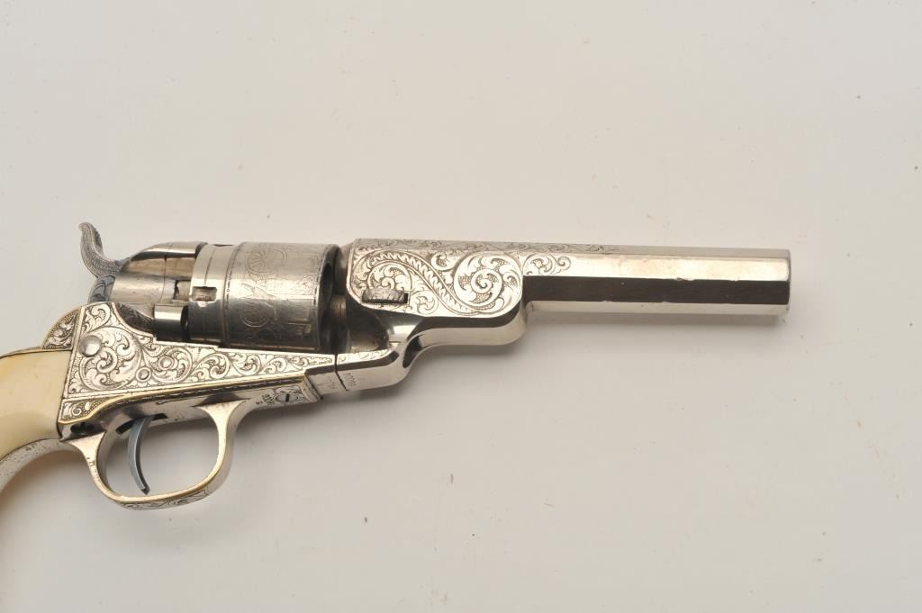18BD-3 FACTORY ENGRAVED POCKET NAVY CONVColt Pocket Navy Conversion to .38 Rim-fire with a 4 ½” barrel, factory engraved, and nickel plated with authentic ivory grips, S/N E 20099. This revolver shows 90%-95% original nickel from the time of theconversion to cartridge. The markings are sharp. The grips are very good with small chips to the left toe. All matching visible numbers. 80%-90% stage coach scene with good markings. Bright blue on firing pin withvibrant case colors on the hammer. A few small scratches and nicks. “The Colt Engraving Book” Volume 1 pictures similar example and lists thei serial number. (Antique) Est.: $5,000-$10,000Colt Pocket Navy Conversion to .38 Rim-fire with a 4 ½” barrel, factory engraved, and nickel plated with authentic ivory grips, S/N E 20099. This revolver shows 90%-95% original nickel from the time of theconversion to cartridge. The markings are sharp. The grips are very good with small chips to the left toe. All matching visible numbers. 80%-90% stage coach scene with good markings. Bright blue on firing pin withvibrant case colors on the hammer. A few small scratches and nicks. “The Colt Engraving Book” Volume 1 pictures similar example and lists thei serial number. (Antique) Est.: $5,000-$10,000